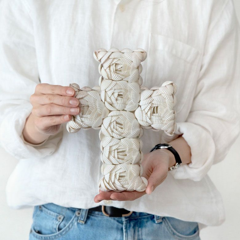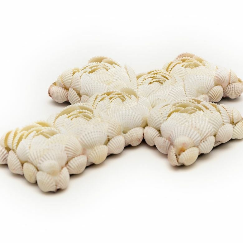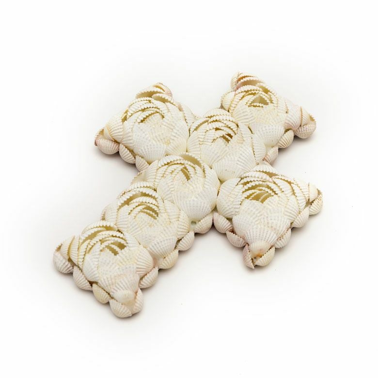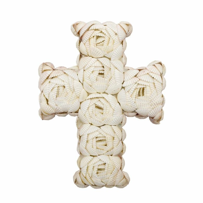 白い貝殻をバラの花のようにデコレーションした、クロス(十字架)型オーナメント。