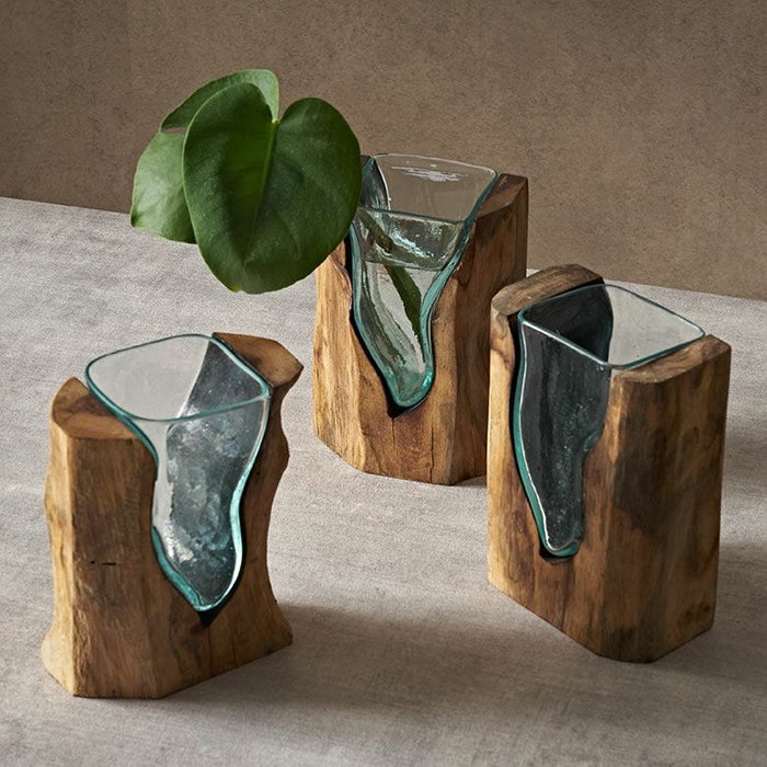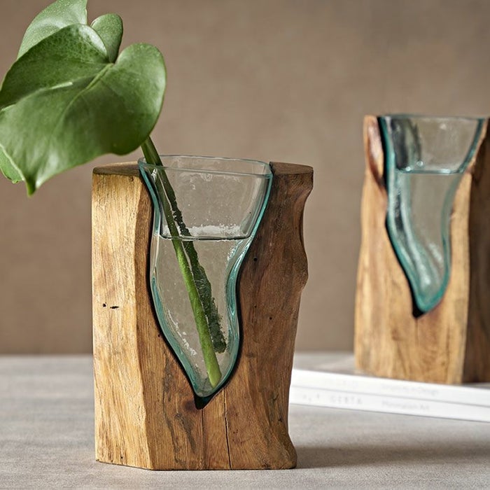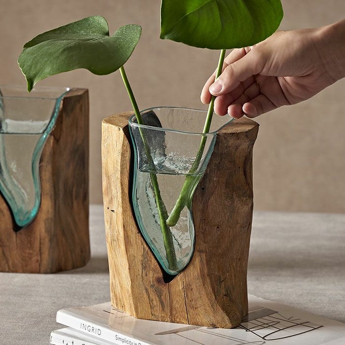 ガラス部分にはリサイクルガラスならではの淡い色味があり、まるで海の底のような自然な美しさを感じられます。フラワーベース自体に個性があるため、お花を飾る事に苦手意識がある方でも、一輪の花やグリーンを置くだけでクリエイティブな印象になります。スワールウッドのやや乾いた質感もこなれ感があって、生けるものの瑞々しさを引き立ててくれます。さらに、ウッドの台座がガラス部分の高さを持ち上げるため、小さなお花やグリーンでもスタイルUPしてくれるのも◎。