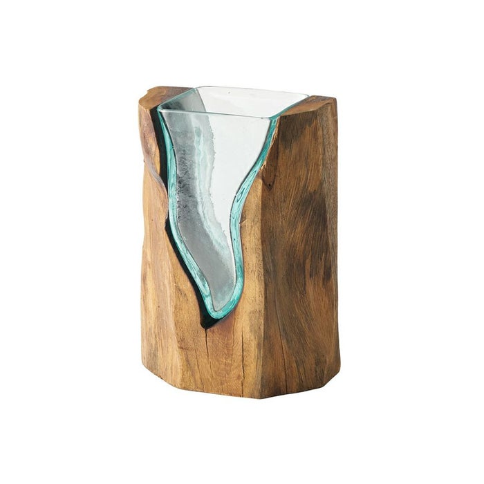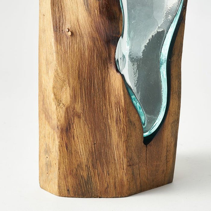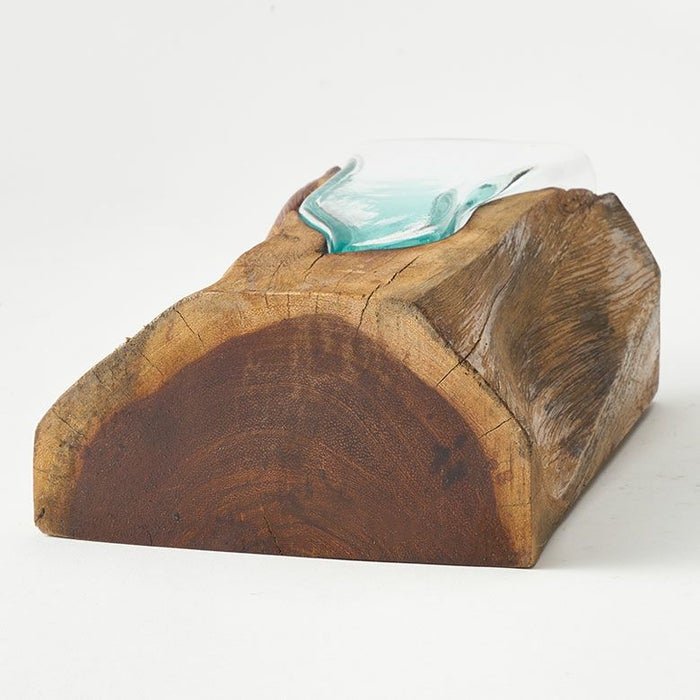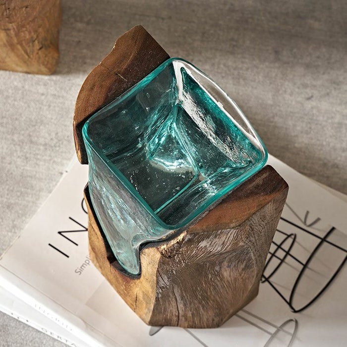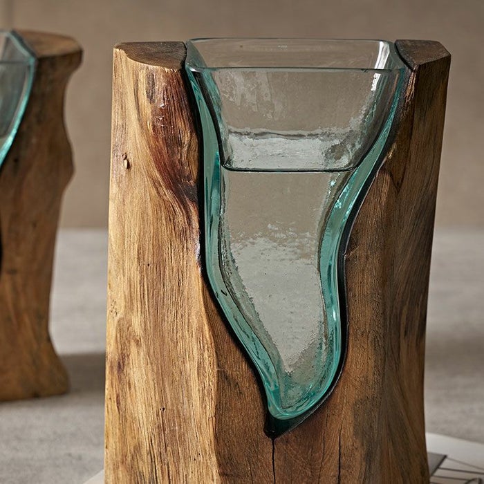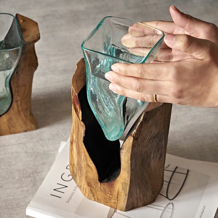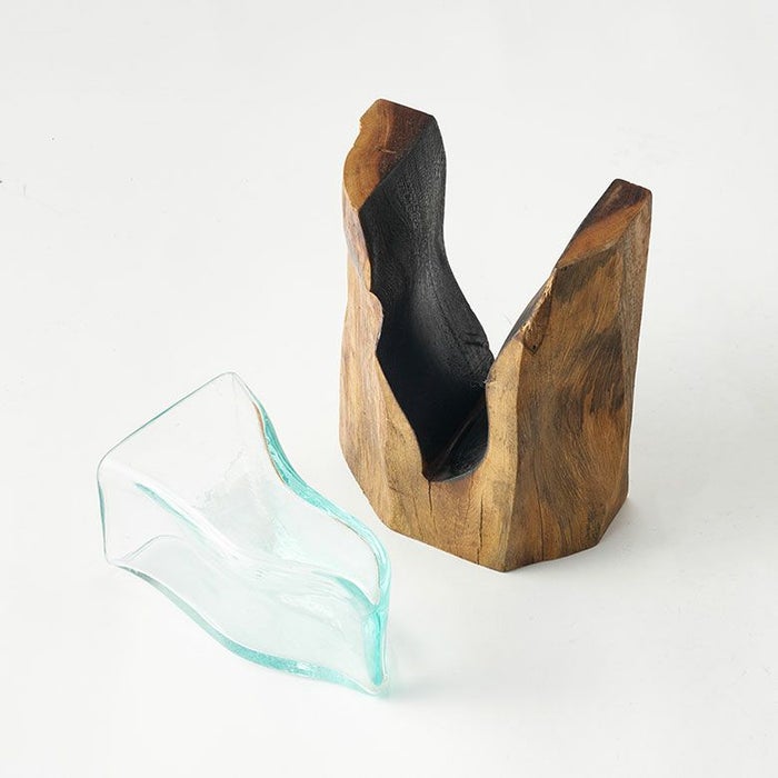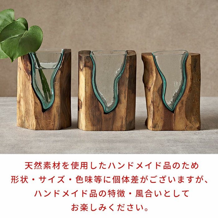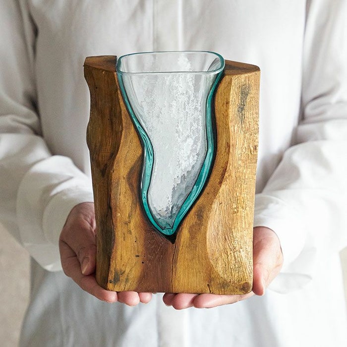 スワールウッドと呼ばれる木の流木とリサイクルガラスを合わせた、世界に二つとないフラワーベースです。新しい木ではなく流木を使用することで、味わい深い個性が生まれ、花やグリーンをより自然な形で引き立ててくれます。