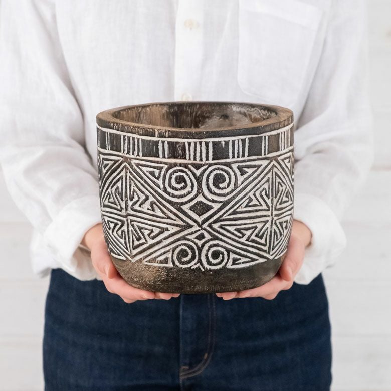 スワーウッドという、高価な彫刻品に用いられる木をくり抜いて作ったプランターカバー。