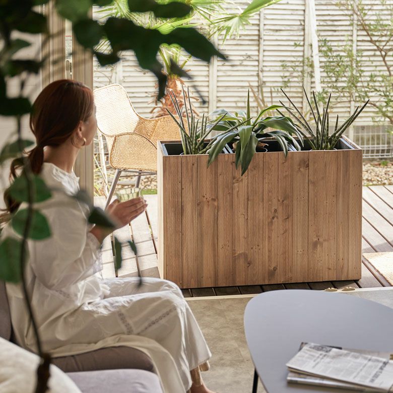 観葉植物もサスティナブルに楽しむ、リサイクルウッドのプランターカバー。