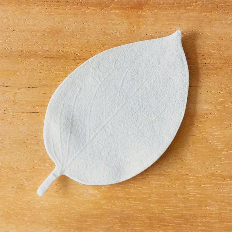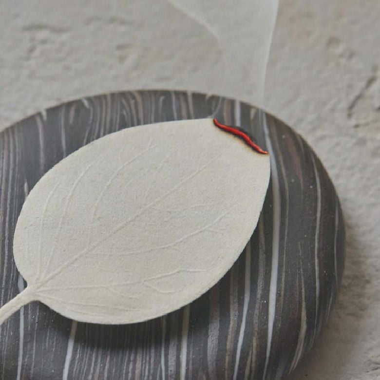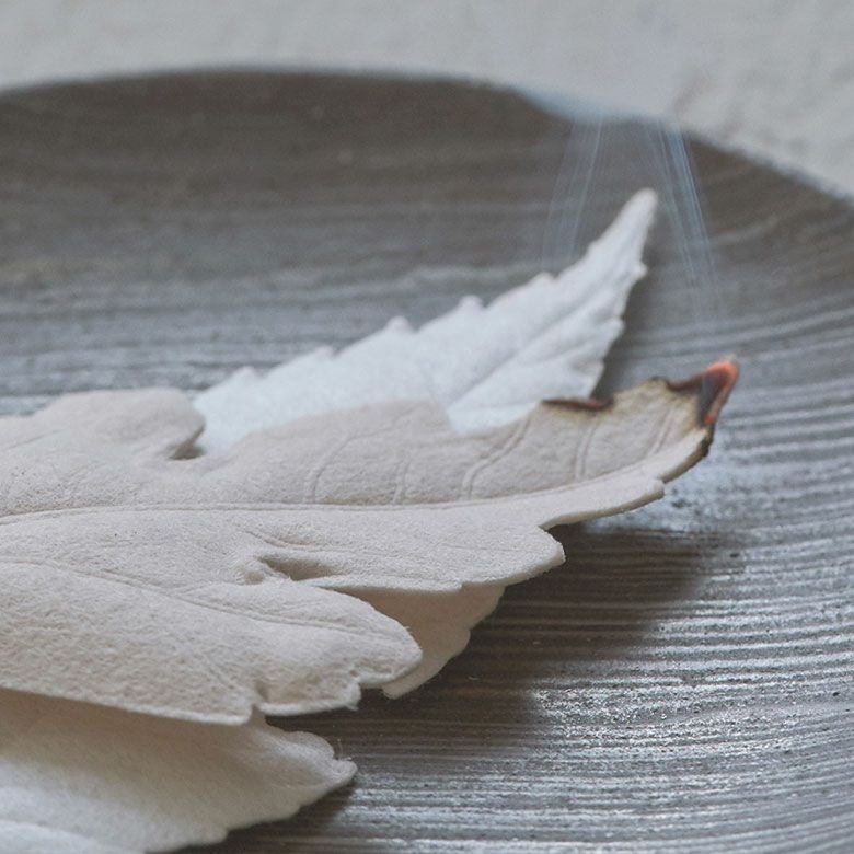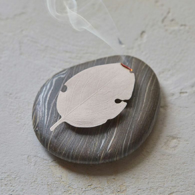 カキの葉っぱをモチーフにした紙のお香。置いて香り、焚いて広がる、新しい和紙のお香です。