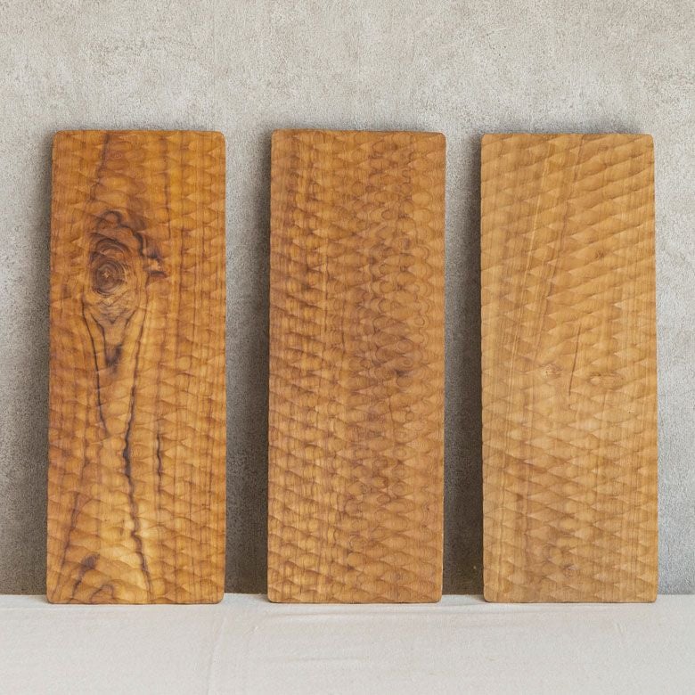 木材の表情がより一層豊かに際立つように、表面を立体的に削り出す「名栗(なぐり)加工」を施しています。