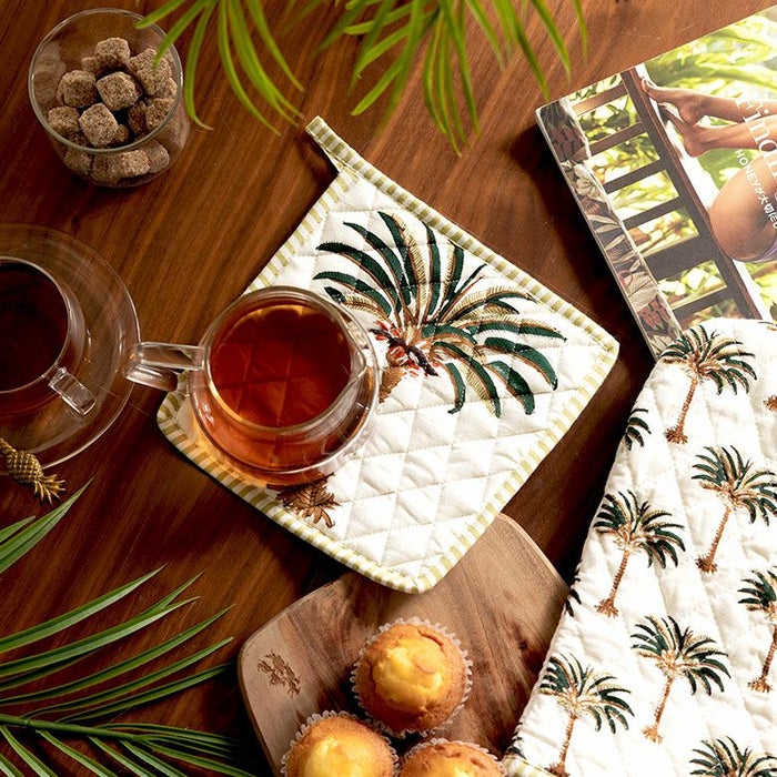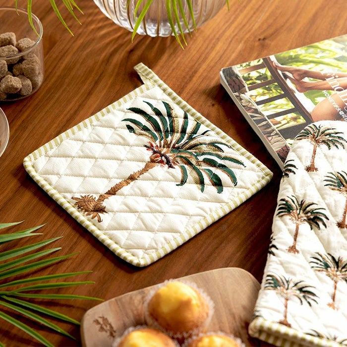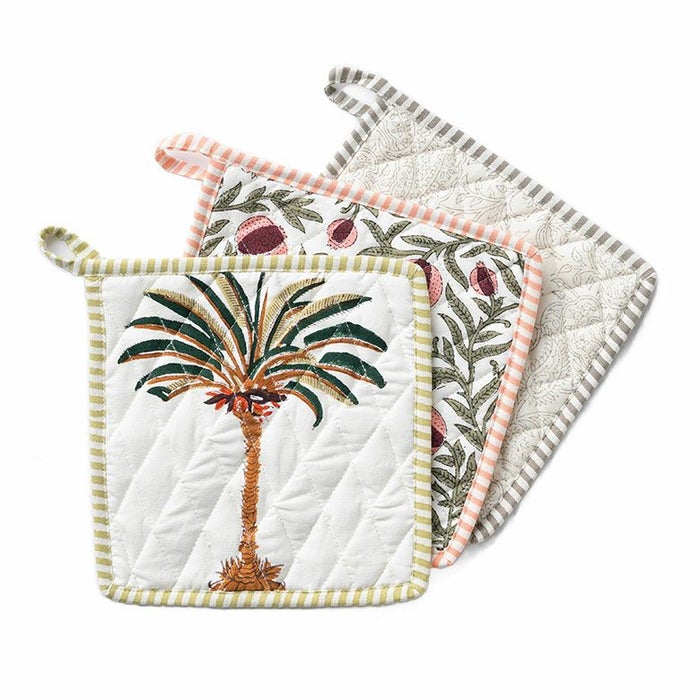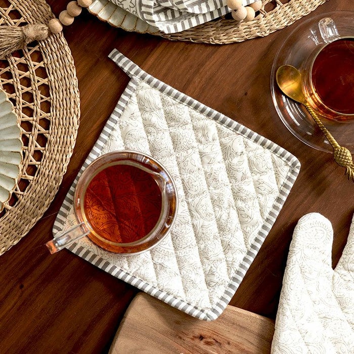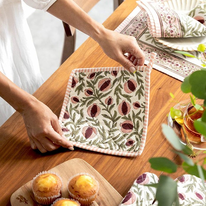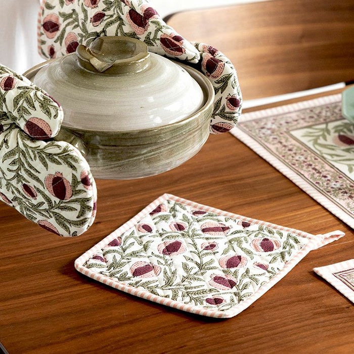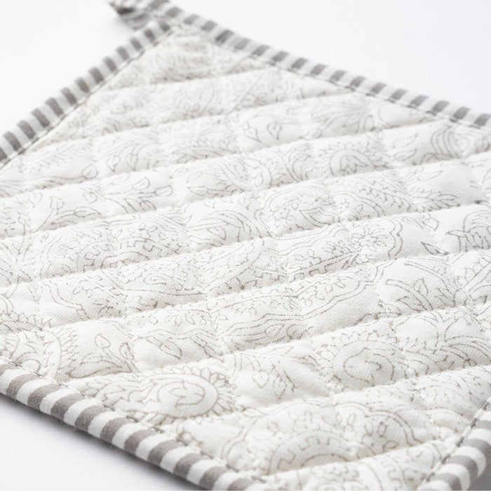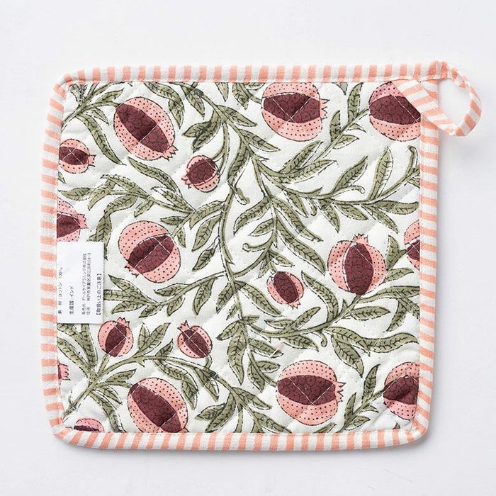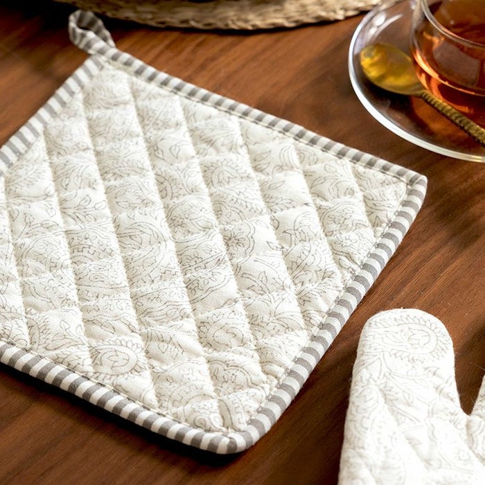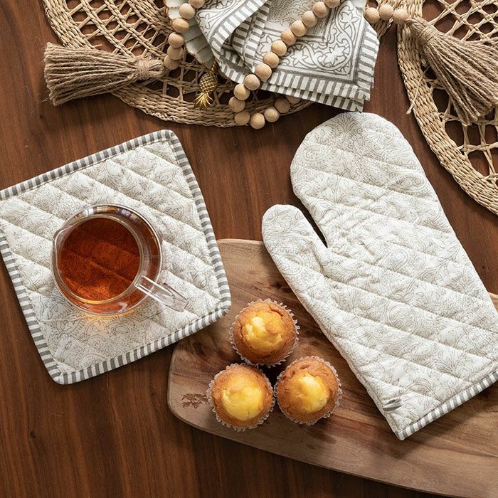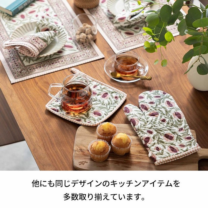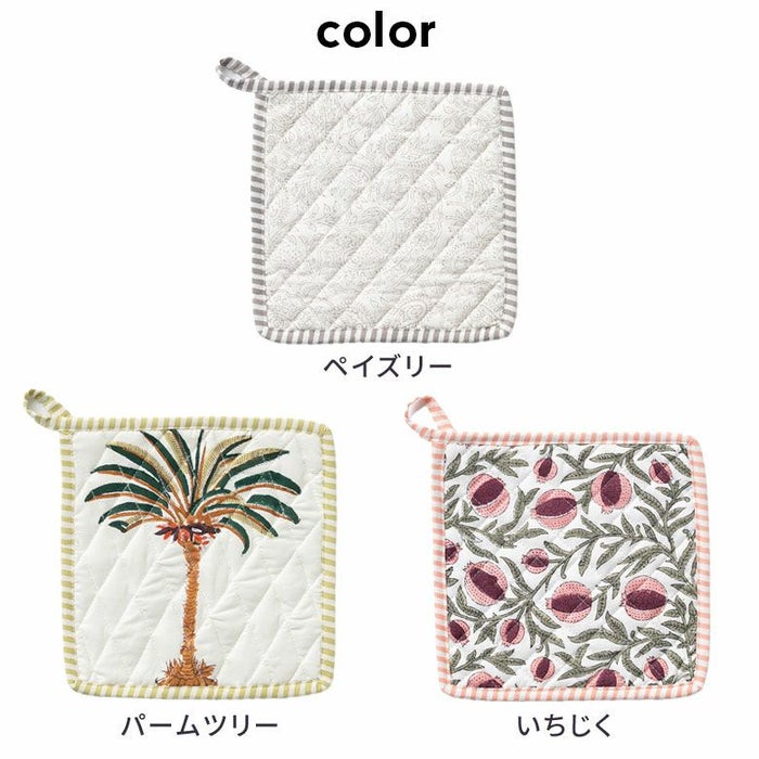 ブロックプリントならではのシャビーな色合いが魅力的な鍋つかみは、映画のベーキングシーンに出てきそうなクラシカルなデザイン。