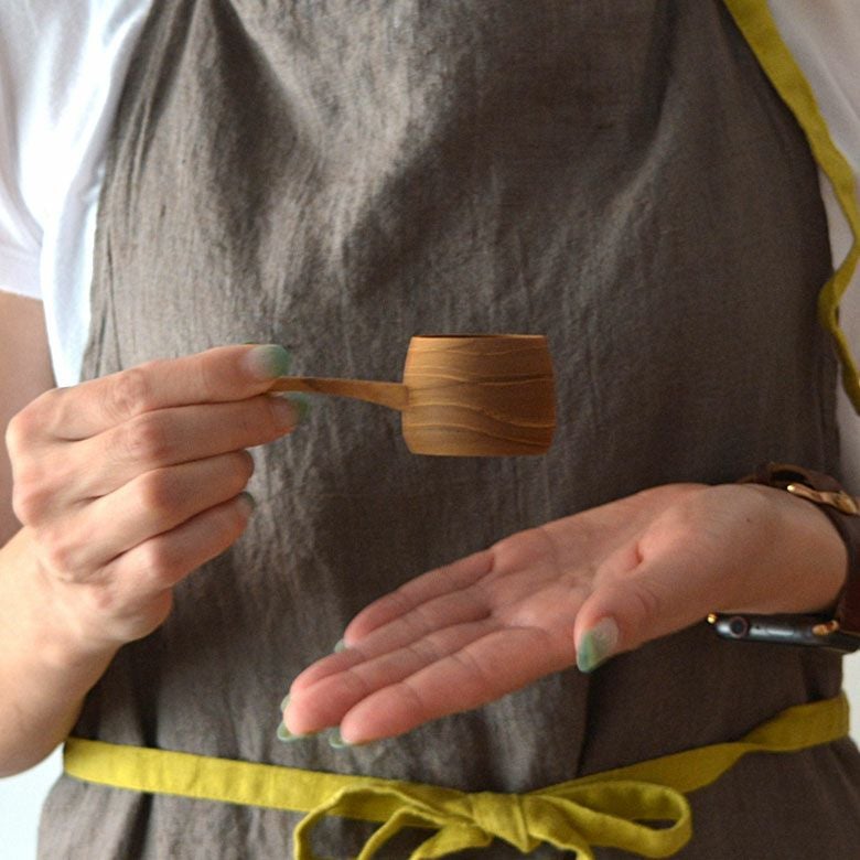 そんなコーヒーラバーさんに使って欲しい、チークのコーヒーメジャー。ドリップ用に挽いたもので擦り切りちょうどで10g(ブレンド)、山盛りで12g(濃いめ)のコーヒーをすくうことができます。