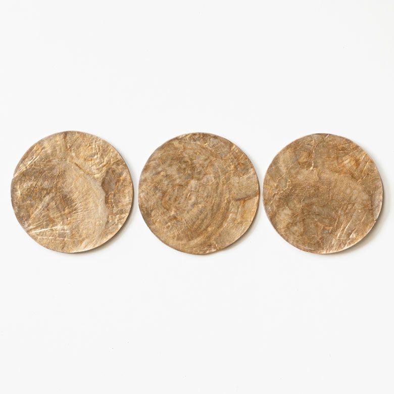 光沢のあるカピスシェルを薄く削り、貼り合わせて作ったコースター。