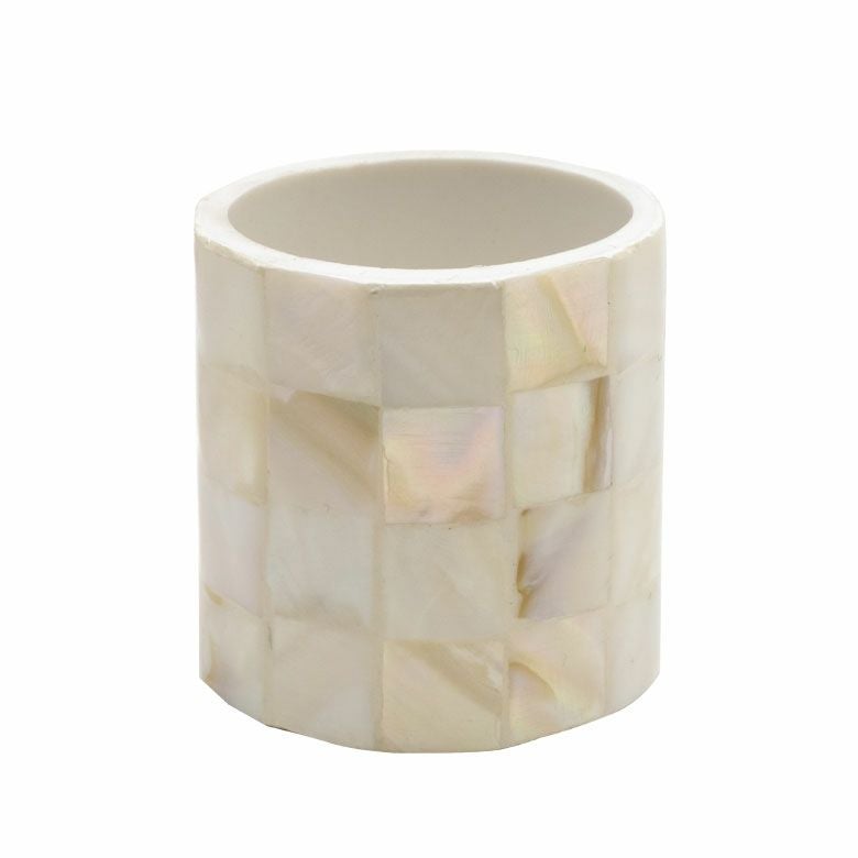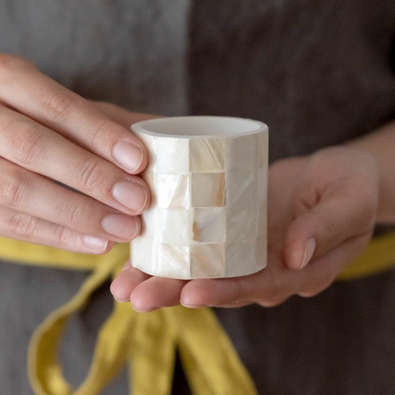 四角くカットした貝殻を白い筒状の樹脂に隙間なく貼り合わせ、なめらかな円形になるまで削って作られています。 天然素材なのでその模様や光沢は同じものが一つとしてありません。