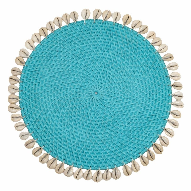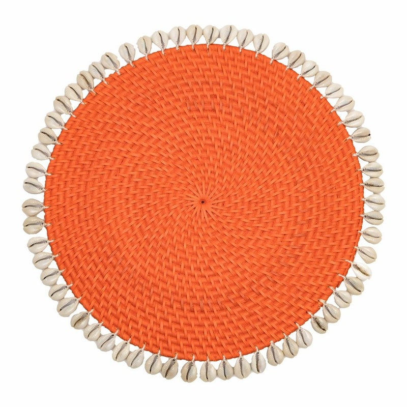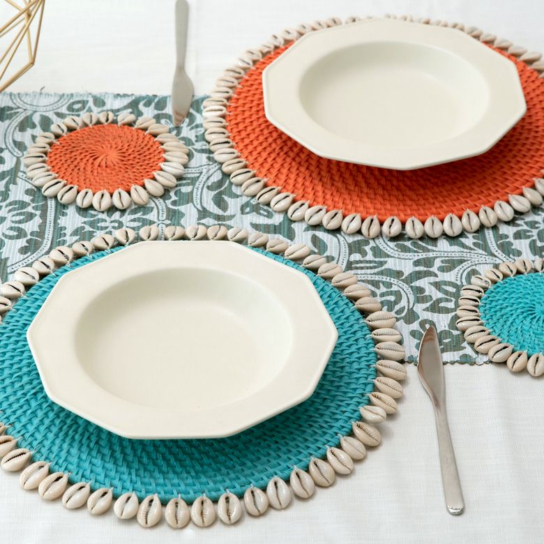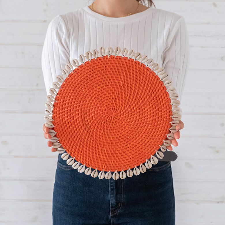 ラタンのランチョンマットのまわりをシェルがぐるりと囲った、リゾート感たっぷりのラウンド型ランチョンマット。