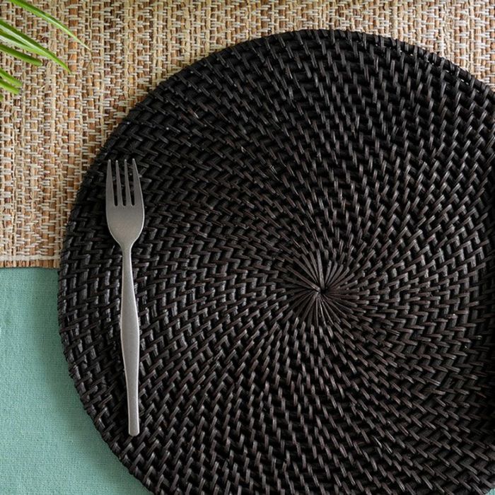 こちらのプレイスマットは天然素材のラタン(籐)を編みあげ、こっくりとした炭黒に染め上げたもの。