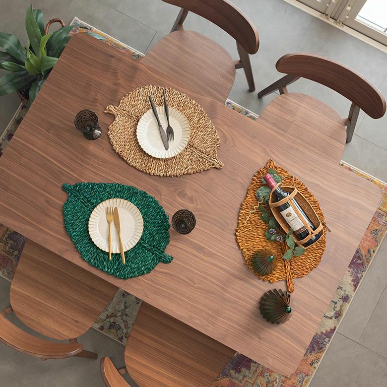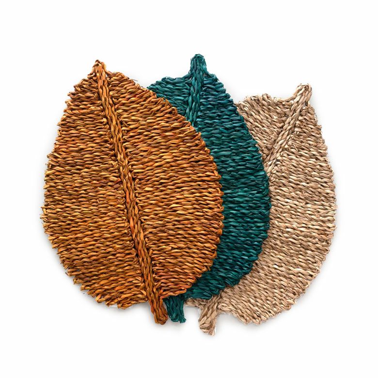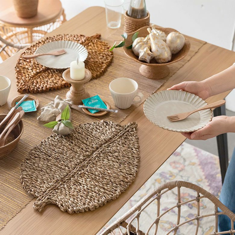 ユニークなリーフ型マットのデザインと落ち着いたカラーで、テーブルを華やかに演出。単色で揃えるも良し、
