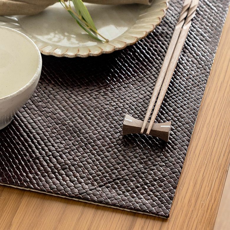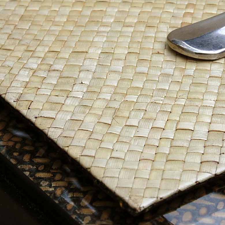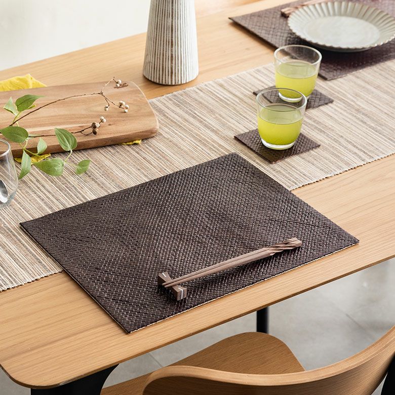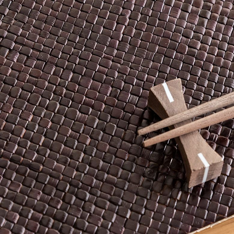 細かい編み目が品よく、まるでレザーのような艶やかな仕上がりです。ナチュラルとブラウンが表裏となっており、一枚で二色楽しめるのもこのマットの特徴。