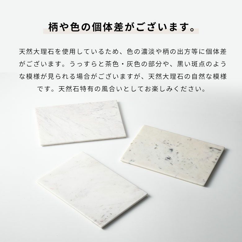 | ご注意 | ※お色・模様の指定はお伺いできかねます。ご注文の際にご希望いただきましてもご対応いたしかねますので予めご了承ください。 ※滑りやすく、重さのある商品ですので、落とさないようにご注意ください。 ※大理石と硬いもの・鋭くとがったものとの接触にご注意ください。傷がつく可能性がございます。 ※大理石部分の表面に茶色やグレーの着色が見られますが、天然素材特有の模様です。 ※天然の大理石を使用している為、1点毎に色調、風合いが異なります。 ※こちらの商品に使用されている大理石は、水分や油分を吸収しやすい特性がございます。水分や油分を含む食品を直接置くとシミの原因となりますのでご注意ください。一度シミになると取れません。 ※洗浄成分の強いものにはご使用いただけませんので、食器洗剤などでのご使用はご遠慮くださいませ。 ※アルコールを含むもの、酸性の強いもの、シンナー、ベンジンなどの溶剤は変質の恐れがあります。また塩素系漂白剤は表面を侵しますので、絶対に使用しないでください。 ※モニターの種類やパソコンの環境により、実際の商品のお色と若干異なる場合がございます。 |
