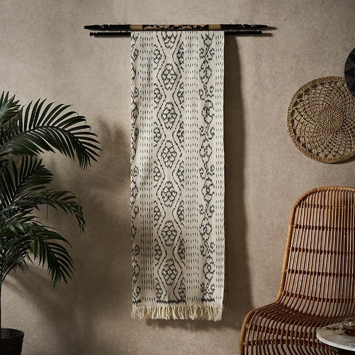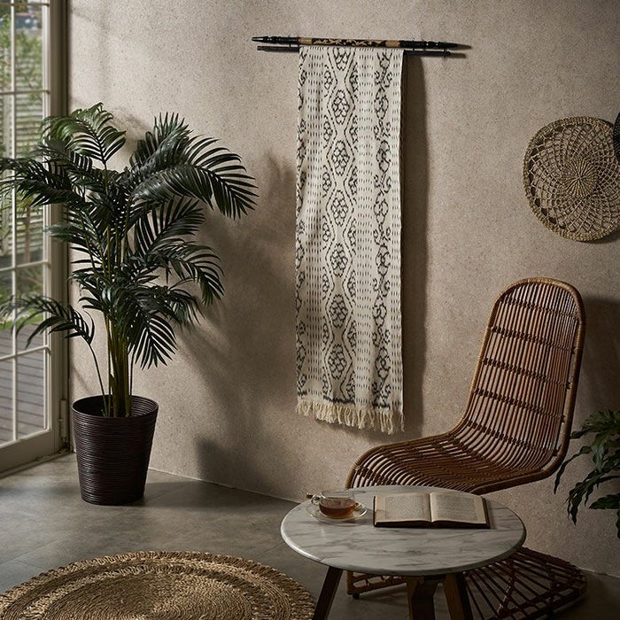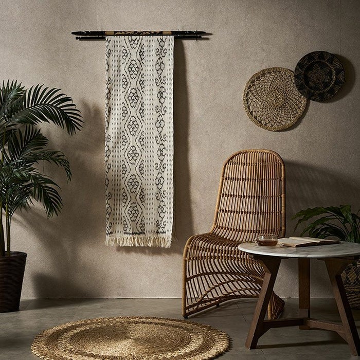 230×115cmと大判のこちらのイカットは、タペストリーのように壁に掛けるのはもちろん、空間の間仕切りとして使ったり、ベットスローやテーブルクロスとしてお使いいいただくのも素敵です。柄がプリントされているタイプの生地と違い、織物ならではの柄の立体感は、飾る空間をより立体的に、奥行きがあるように見せてくれます。単調な柄ではないため、生地の見せる部分によって雰囲気が変わるのも、イカットの面白いところです。