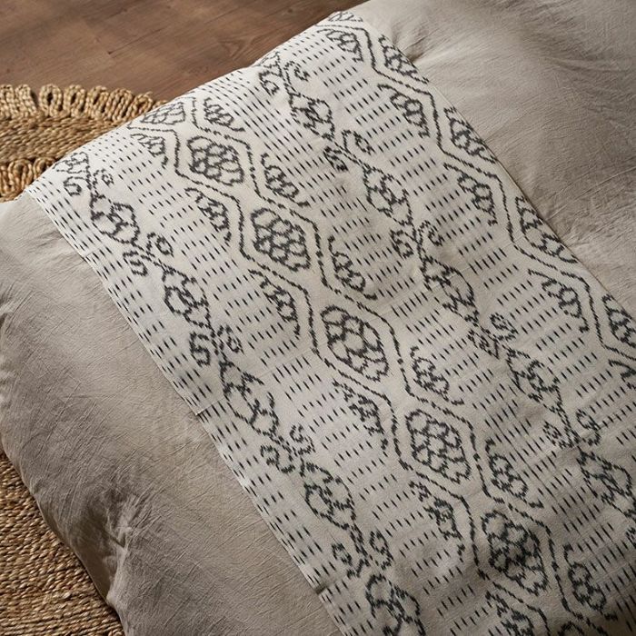 生地がしっかりしていてバティックなどより厚みがあります。5柄ありますが一枚一枚色柄が違い、使う場所や用途によって雰囲気がガラッと変わります。どの柄もアンティークのようなかすれた風合いが他の生地にない表情で、インテリアに落ち着きを与えてくれます。お家サロンやスパなどで間仕切りやカーテンのような使い方をされる方もいらっしゃいました!厚みがあるので透ける心配がないのも使い勝手がいいポイントですよ。
