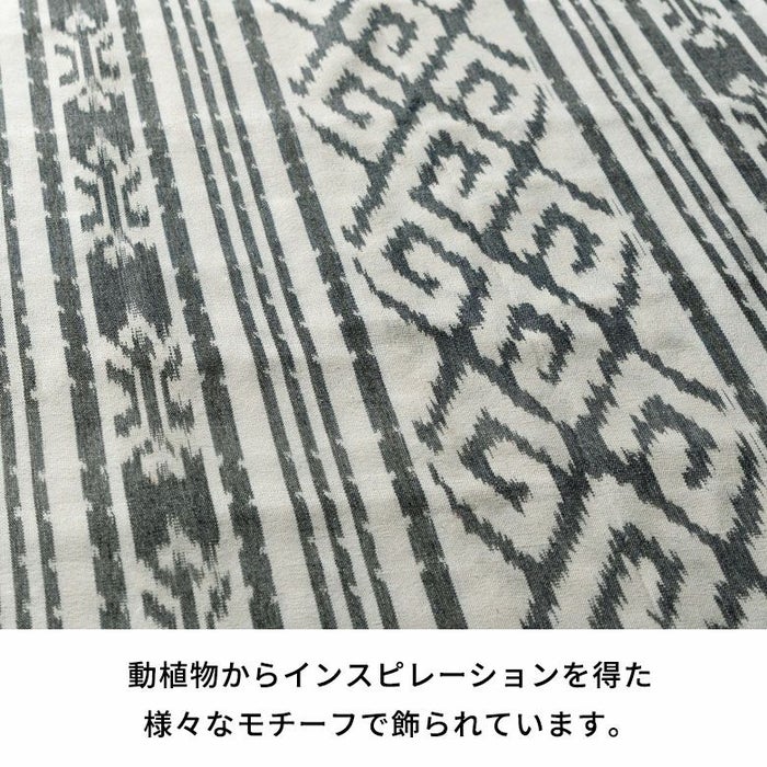 Ikat(イカット)はインドネシア語で「縛る・結ぶ」という意味。染めた糸を織って模様を表現する伝統的な織物です。イカットの特徴はかすれたような奥行きのある模様。この独特な風合いは、「絣(かすり)」という技法を用いられることにより生まれます。