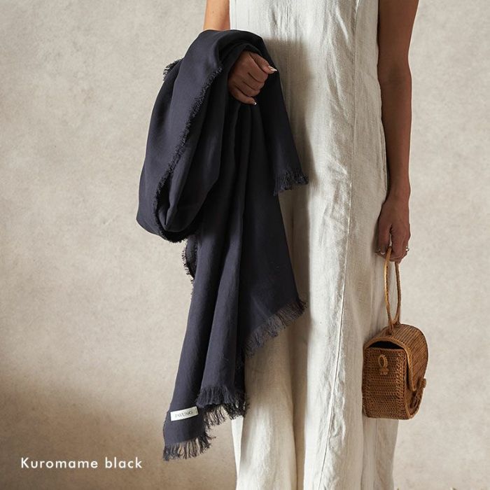 『Kuromame black(黒豆ブラック)』は真っ黒の一歩手前のチャコールカラー。顔回りに真っ黒は強過ぎる、という方にも使って頂き易い優しいダークトーンです。黒はいつの季節も便利で大好きなカラー。でもシーズンレスに使って頂くなら少し軽やかさも欲しい、ということで濃さにこだわり、究極の炭色に染め上げてもらいました。オールブラックコーデでもモノトーンコーディネートでもコットンの手触りとともに優しさと軽やかさを加えてくれる、黒豆のようなこっくりとしたブラックです。