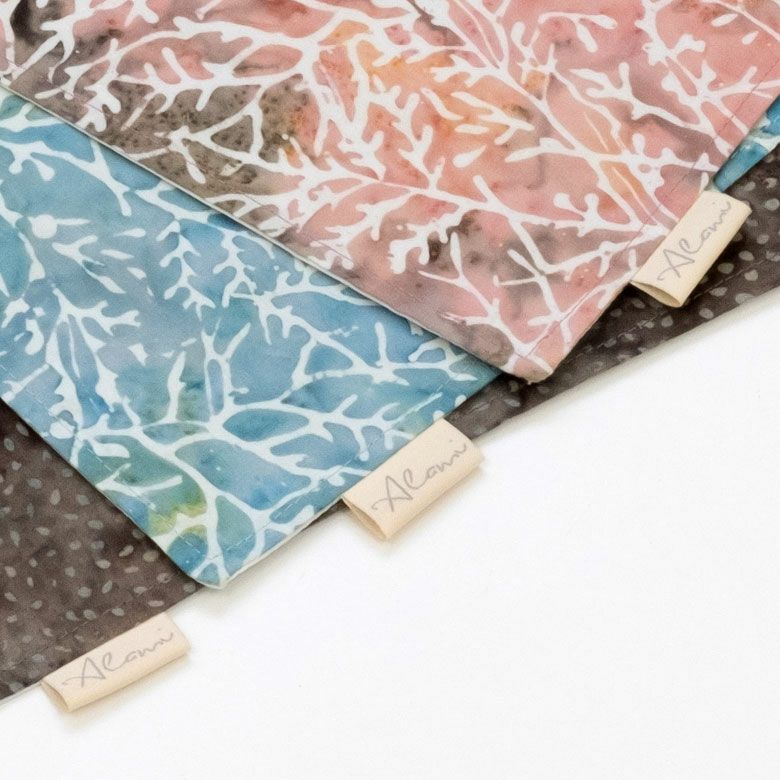 | ご注意 | ※ハンドメイドのためサイズ・形が写真と異なる場合があります。 ※染めもののため、色合いや柄の表情が1点1点異なります。 ※洗濯をすると色落ちする場合がございますのでご注意ください。 ※製法上、ろうが粉状になって生地に残ることがございますが、使用に関して問題はございません。 |
