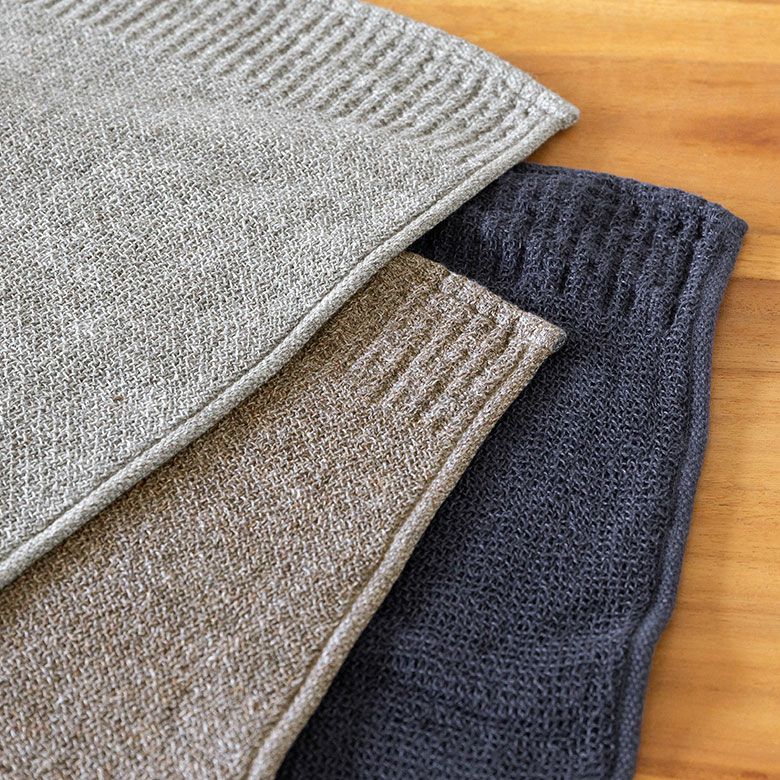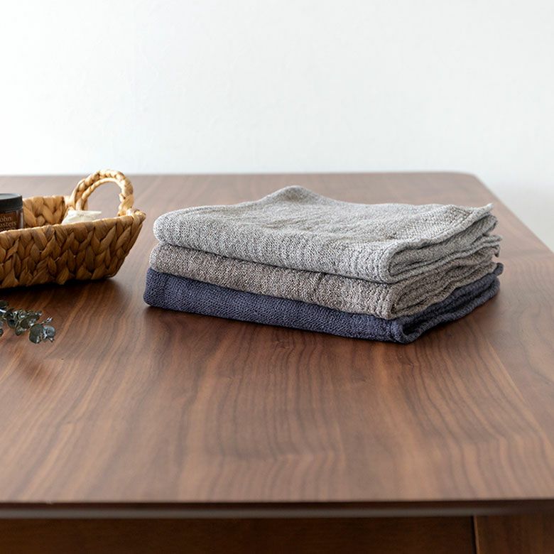 落ち着きのあるシックな色合いでタオル特有の生活感がなく、バスルームに掛けてあっても洗練された印象のバスタオル。ニットのような質感なのでひざ掛けなどに使われる方もいらっしゃいます。3色どの色もいい色なので色違いで洗い替えとして揃えても、一色で統一感を出してもどちらもおススメです。洗う度にこなれてくる感じもとてもいいですよ。ラーナは男性にも人気があるタオルです♪