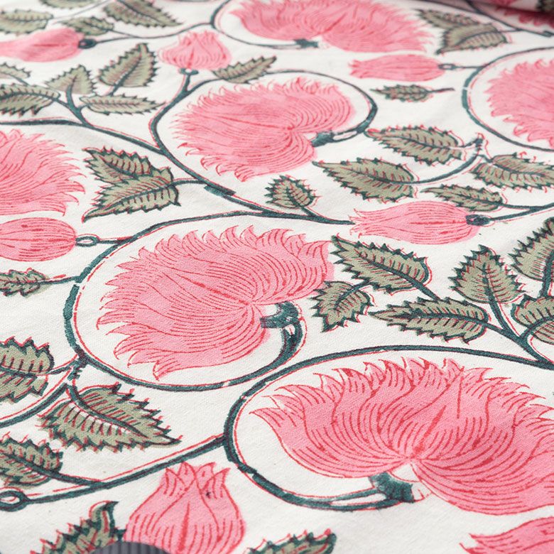 インドならではの色使いと、「ブロックプリント」で描かれた個性的なパターンが美しいファブリック。