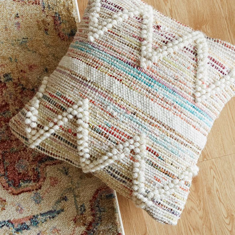 白地にランダムカラーの生地が編み込まれているのがポイントでとっても優しい可愛いさ。 様々なテイストに良くなじむので、是非お部屋のコーディネートにおすすめしたいアイテムです。