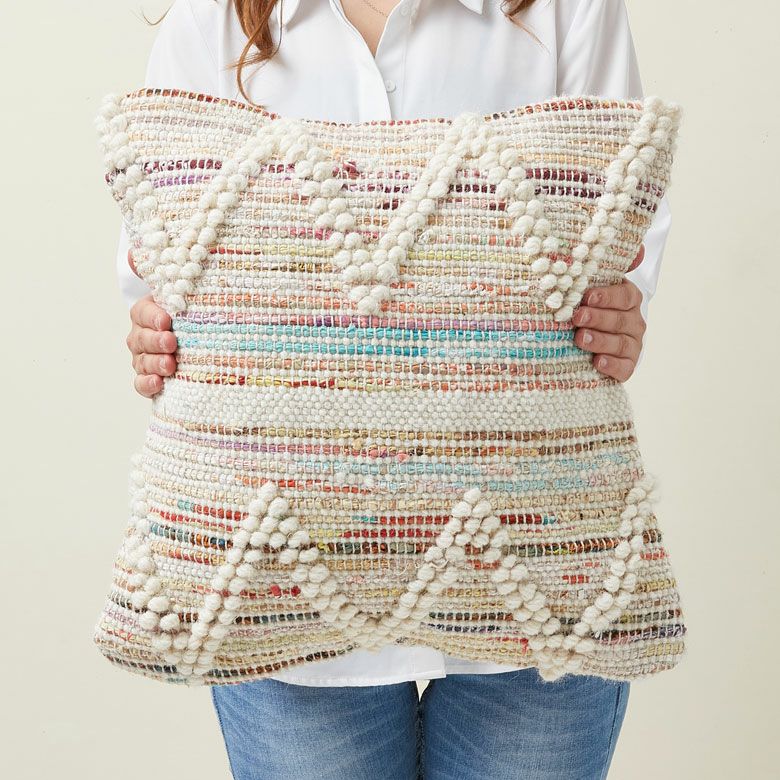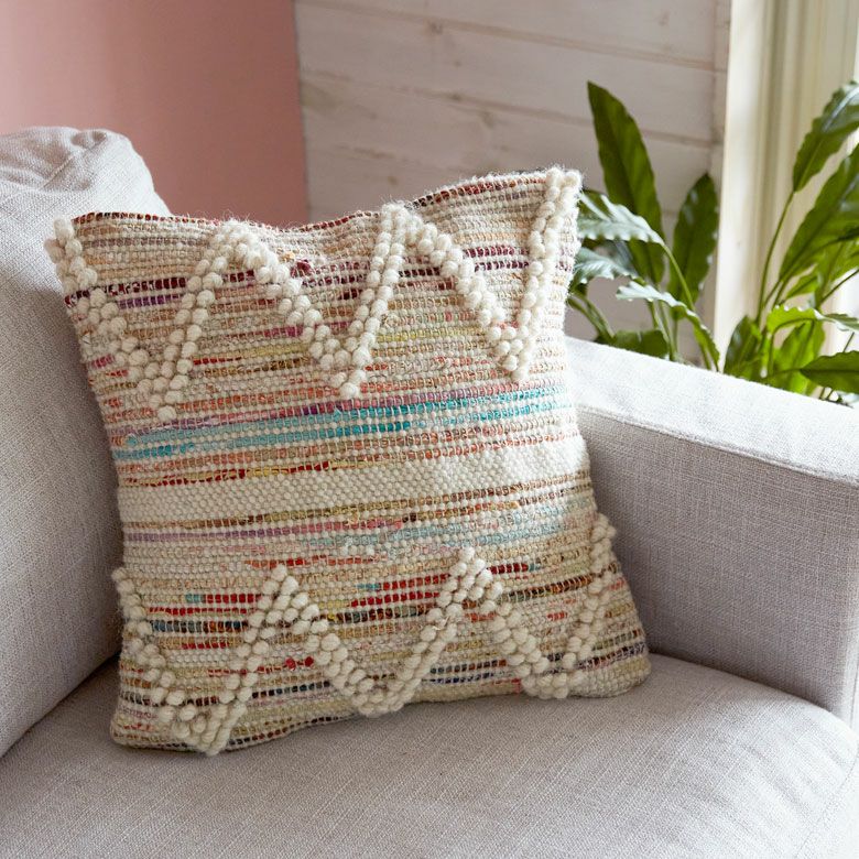 ポコポコとした編み目が何とも愛らしいクッションカバー。 こちらは、インドの職人により全て手織りで作られています。 ウール&コットン使用で、夏はさらさら、冬はふんわり温かく、オールシーズンお使いいただけます。