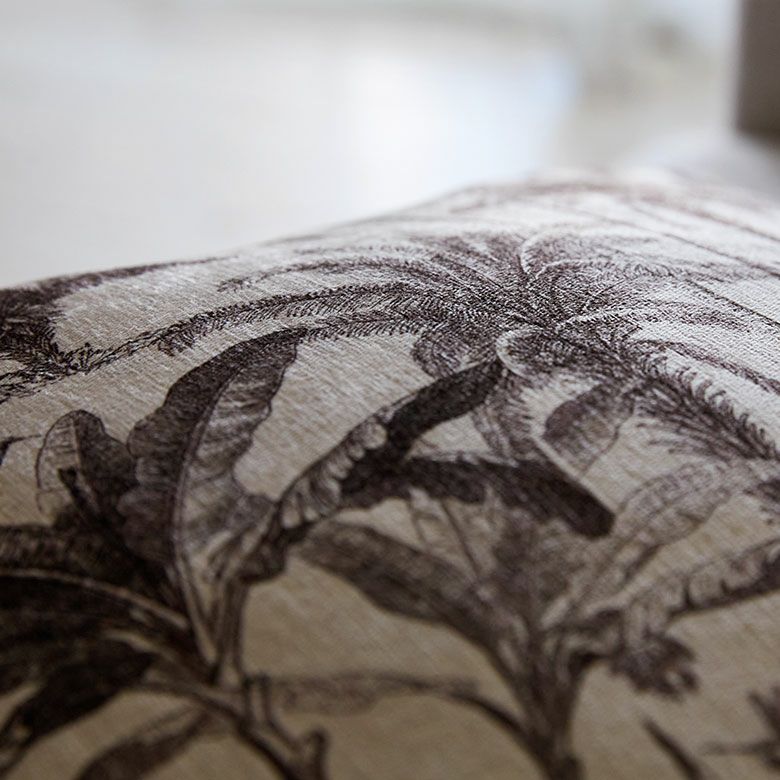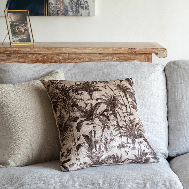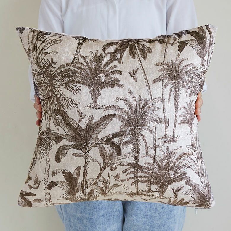 繊細なタッチでヤシの木や南国の野鳥が描かれた、ジャングルアートのようなリラックスムード漂うクッションカバー。 モノトーンカラーでとってもオシャレです。 季節問わず使いやすい色味で、秋冬のスタイルにもオススメ。 海風の雰囲気が漂うパームツリーモチーフは ジュートやラタン、ラフィアなど天然素材アイテムとの相性もバッチリです。