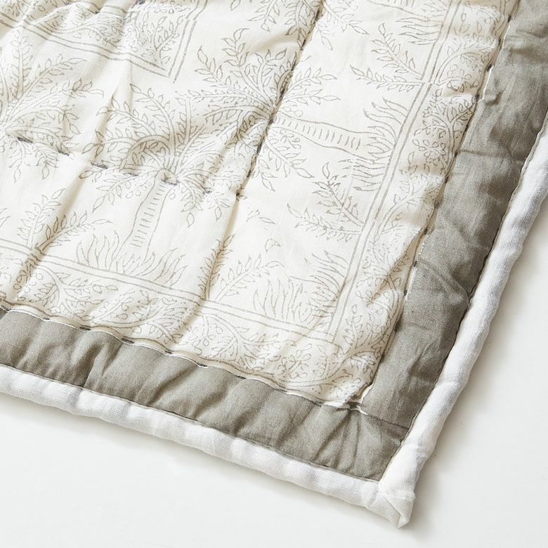 Payung実店舗でも好評のインドファブリックの中から、味わい深いブロックプリントで、柔らかいキルトのマルチカバーをご紹介します。 ブロックプリントは、木版にインクを付けて一柄一柄丁寧に生地に押し当てていくインドの伝統工芸。 素材はコットン100%でさらに中綿入り。やわらかい肌ざわりのキルト仕上げになっています。