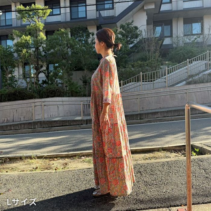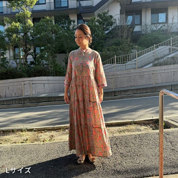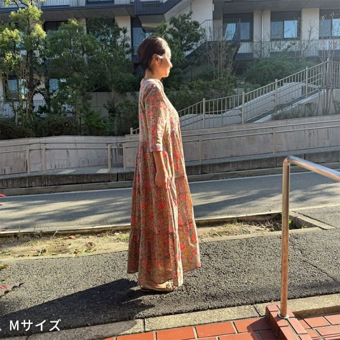 サイズ(cm) | サイズM ・肩幅:約 39cm ・着丈:約 123cm ・身幅:約 53cm (両袖の付け根下の直線距離) ・胸下切り替え部分横幅:約 50cm(一番細くなっている部分) ・肩から胸下切り替え部分までの長さ:約 38cm ・袖丈:約 39cm (肩先から袖口までの直線距離) Lサイズ ・肩幅:約 40cm ・着丈:約 128cm ・身幅:約 54cm (両袖の付け根下の直線距離) ・胸下切り替え部分横幅:約 52cm(一番細くなっている部分) ・肩から胸下切り替え部分までの長さ:約 39cm ・袖丈:約 40cm (肩先から袖口までの直線距離) ※採寸は平置きです。またインドでのハンドメイドのため多少の誤差があることをご了承ください。 [モデル身長160cm] |