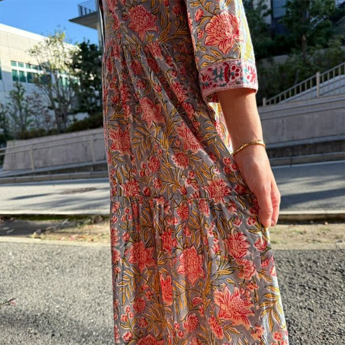 一枚あると気分が上がる花柄ワンピース!コットン100%の軽やかさとブロックプリントの華やかさが気持ちを上げてくれるワンピースです。