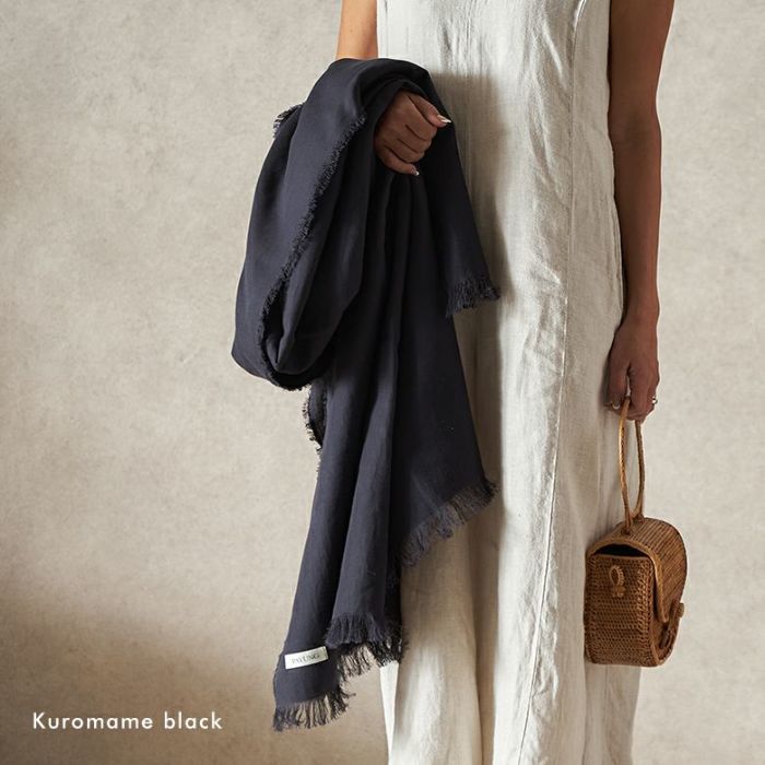 『Kuromame black』は真っ黒の一歩手前のチャコールカラー。顔回りに真っ黒は強過ぎる、という方にも使って頂き易い優しいダークトーンです。黒はいつの季節も便利で大好きなカラー。でもシーズンレスに使って頂くなら少し軽やかさも欲しい、ということで濃さにこだわり、究極の炭色に染め上げてもらいました。オールブラックコーデでもモノトーンコーディネートでもコットンの手触りとともに優しさと軽やかさを加えてくれる、黒豆のようなこっくりとしたブラックです。