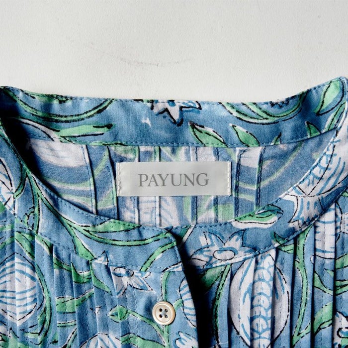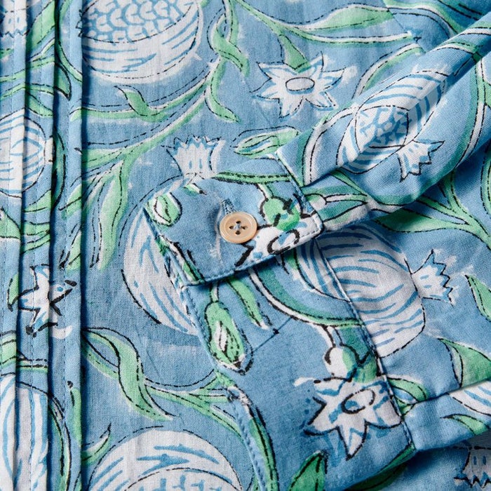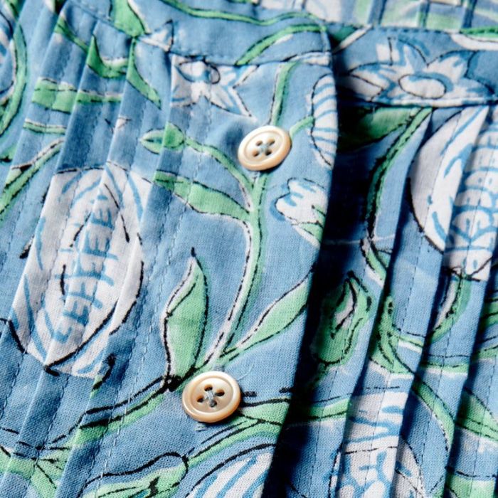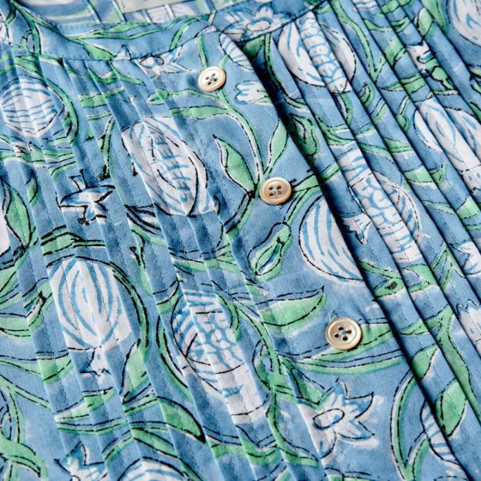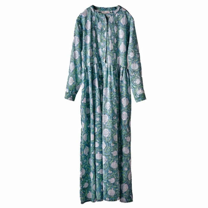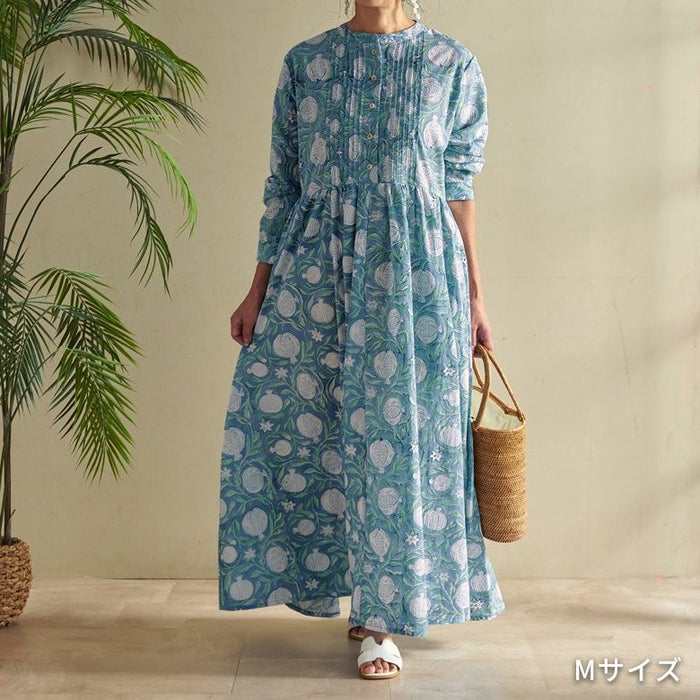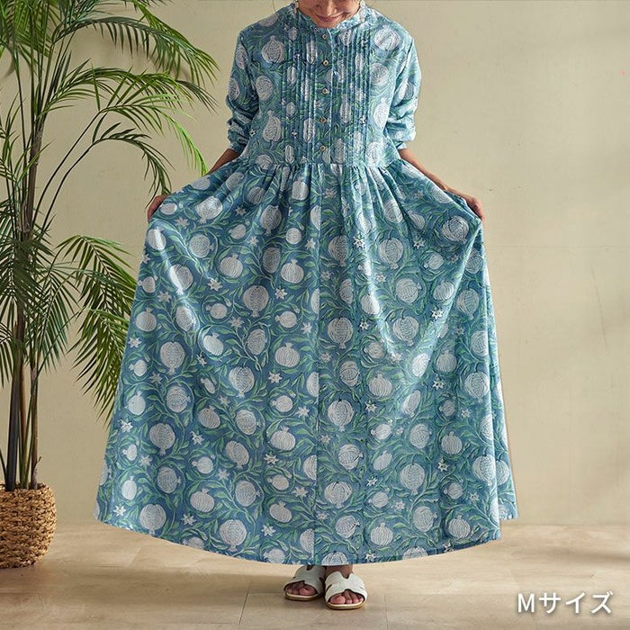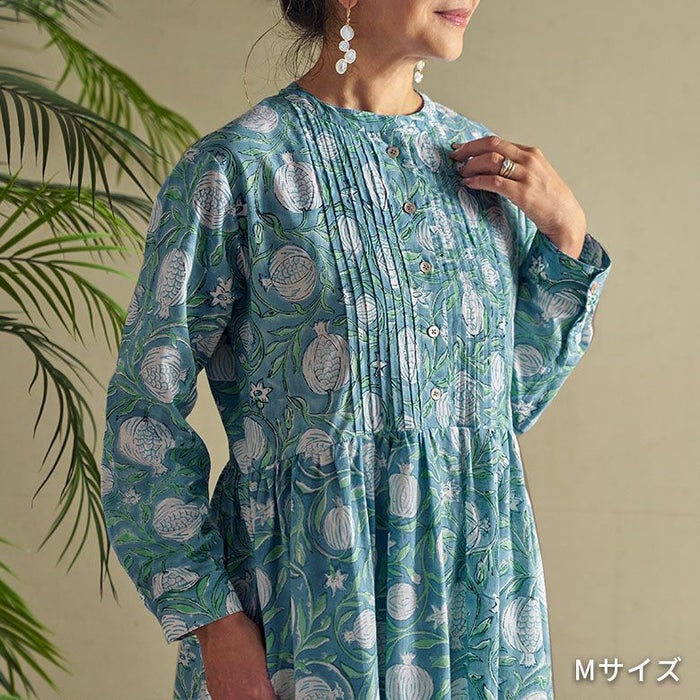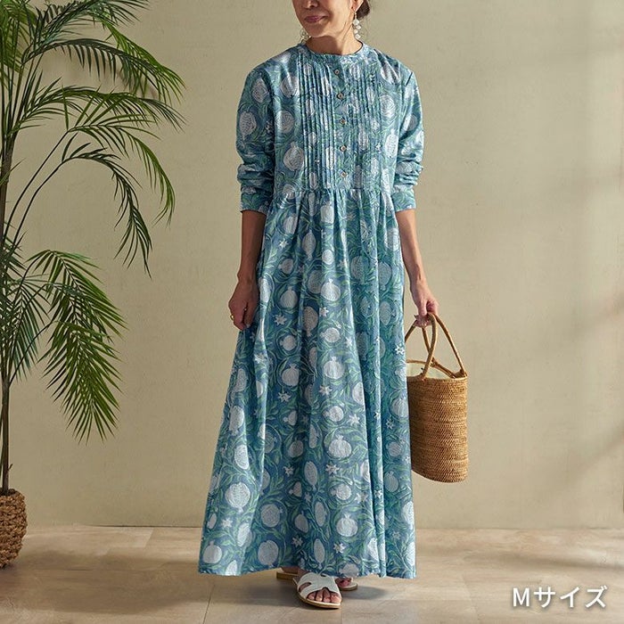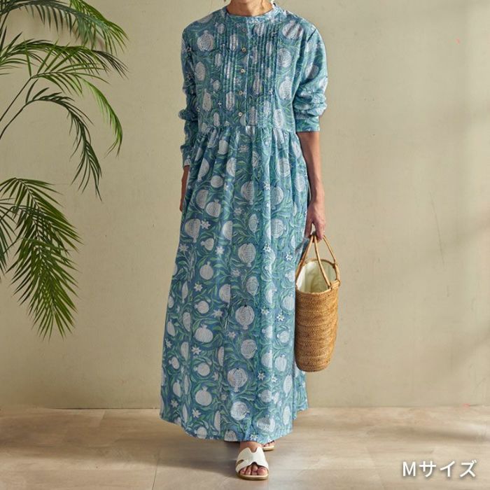 落ち着きのあるブルー地に、グリーンで描かれた葉っぱの爽やかさがプラスされた、清々しいブロックプリントワンピース。袖はフルレングスで、胸元のピンタックが上半身をスッキリ見せてくれます。ボタンを上まで留めると、きちんと感も出る女性らしいワンピースです。