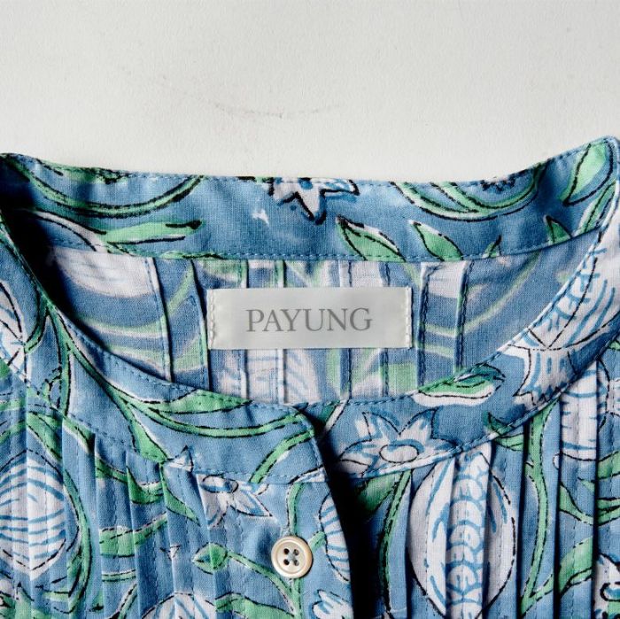 生地には、インドのブロックプリント生地を使用。同じ柄をリピートしたデザインですが、絵柄の中に大小さまざまなデザインが施されており、ブロックプリントならではのかすれやにじみが、ワンピース全体を立体的に見せてくれます。シンプルなシルエットでありながら、奥行きのある雰囲気を醸し出してくれます。