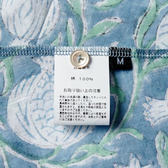 お手入れ方法 | ・ブロックプリントは素材や染料の特性上、色落ちや色移りの可能性がございますので単独でのお洗濯をおすすめいたします。 ・洗濯機で洗濯可能ですが必ずネットに入れ、手洗いモードでのお洗濯をお願いいたします。 ・洗濯後は軽くしわを伸ばし、日陰干しでの自然乾燥をおすすめいたします。直射日光は色落ちや変色の原因となりますのでお控え下さい。 ・インドにて水通しされておりますが、入荷後の染色止めは施されておりません。水1Lあたり大さじ1杯の塩を溶かし、一晩漬け置きすると染料を定着させ色落ちがしにくくなります。お試し下さいませ。 |