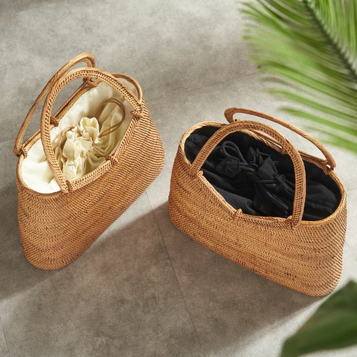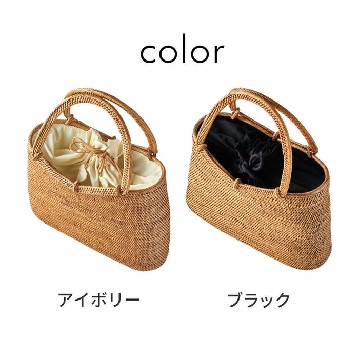 中にはブラック、もしくはアイボリーの巾着が付いており、中が丸見えにならず、中に入れるものも傷つけずに収納することができます。内布は紐でしっかりと絞れるため、混雑した場所でも安心です。巾着の内側には鍵などを収納できる小さなポケットも付いていて、カゴバッグでありながら機能性も充実しています。