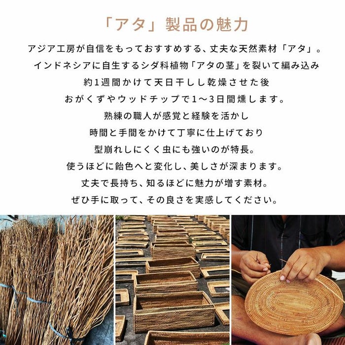 アタはインドネシアに自生する「アタ」というシダ科の植物。そのアタを乾燥させ、茎の部分を丁寧に裂いて編み込み、約一週間天日干しして乾燥させた後、ココナッツチップなどで1~3日間燻します。