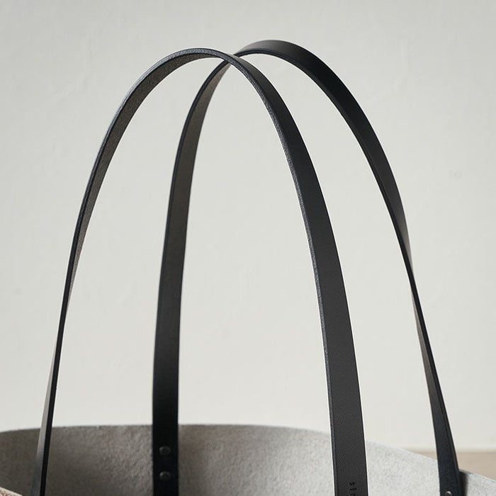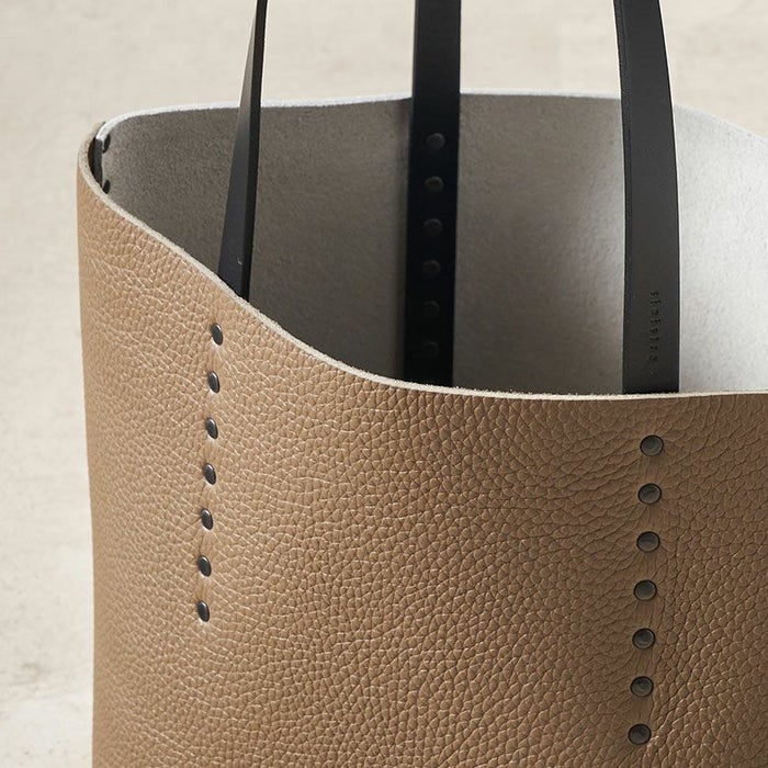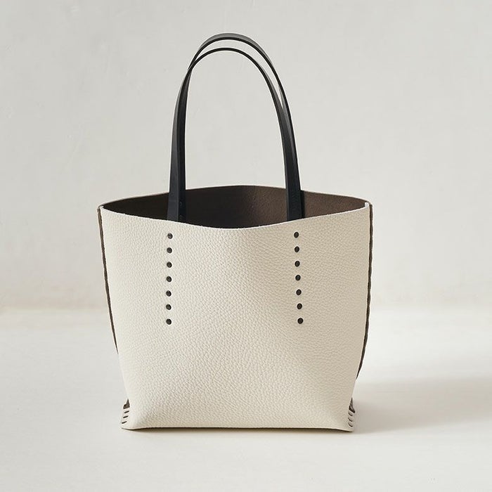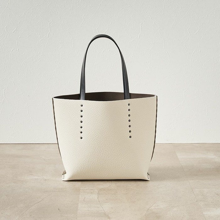 ユニセックスでありながらどこかエレガントで品のあるこちらのバッグは、Payungで一番人気のあるツートーンカラーでご用意致しました。グレーとベージュを掛け合わせたようないいとこどりのエトープ×白いチョークのようなカラーのクレ、そこに2色を引き締めるマットブラックのリベットで仕上げています。
