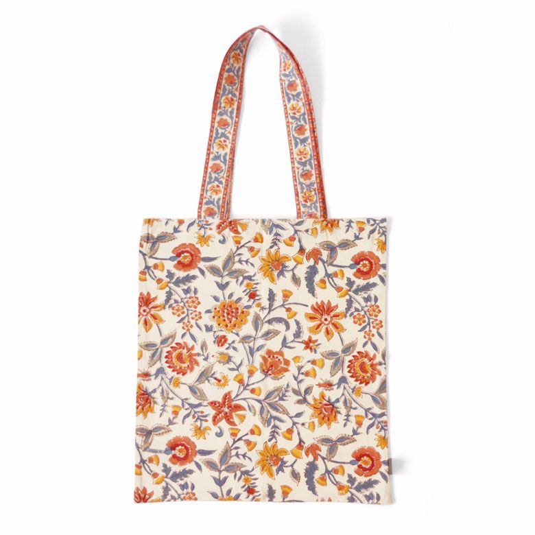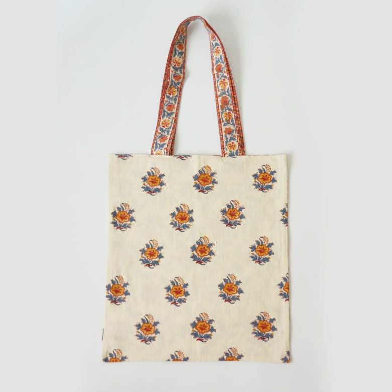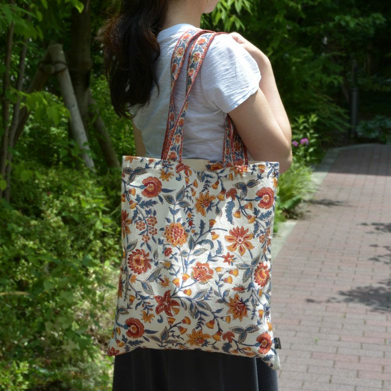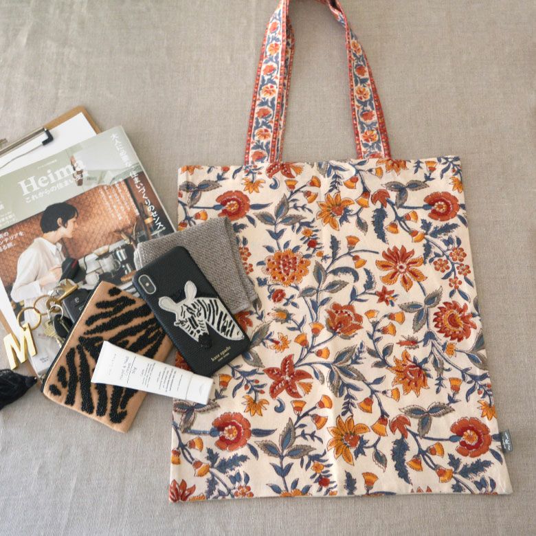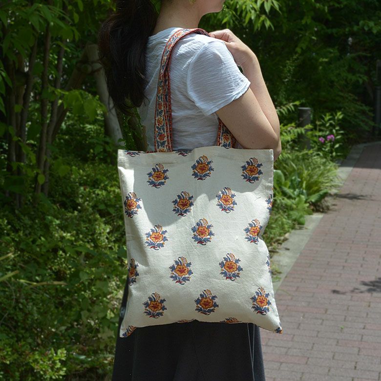 鮮やかでちょっとレトロな模様がキュートな、インドのブロックプリントのトートバック。