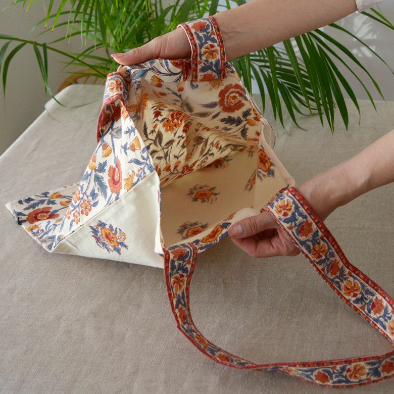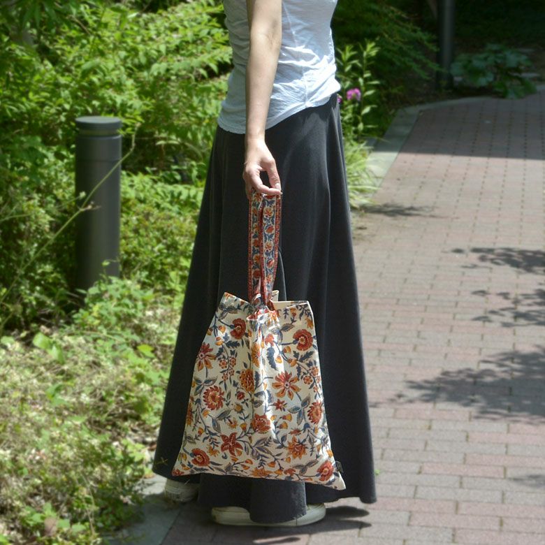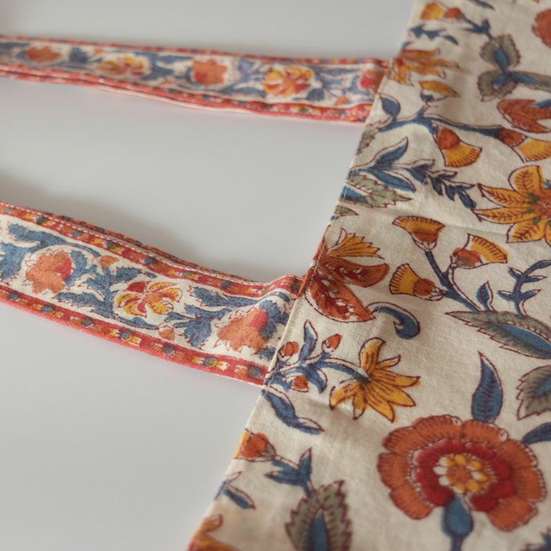 インドのファブリックらしい鮮やかな柄と、コットンのこなれた風合いがとても目を引くバック。