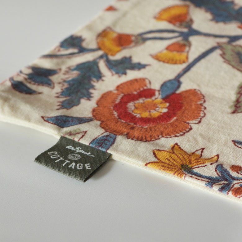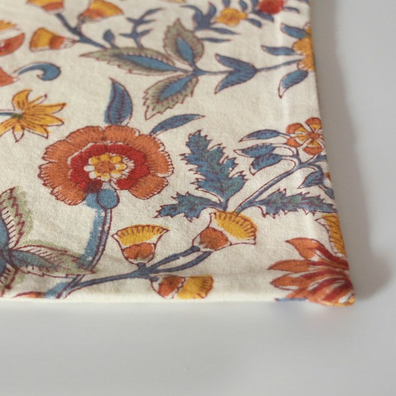 こちらのホワイトはやや黄色みがかったアイボリーベース。色々な形の花が咲いている、インドのブロックプリントらしい柄です。