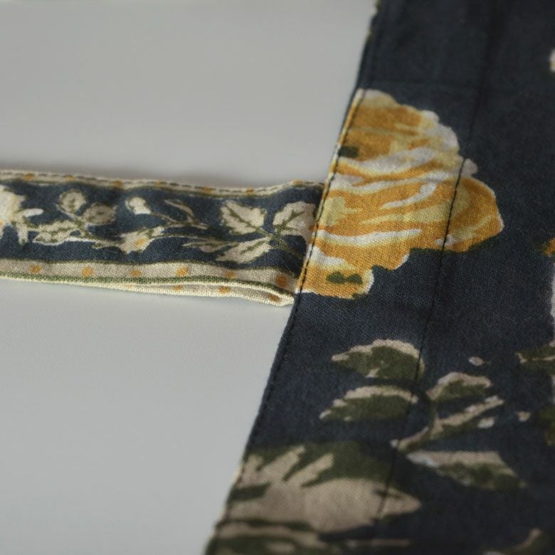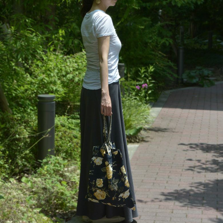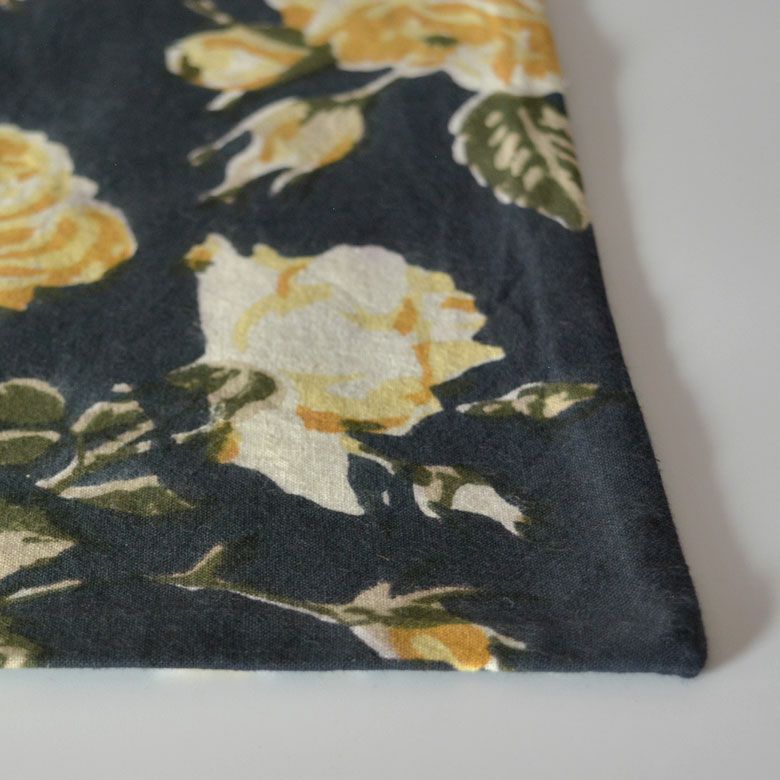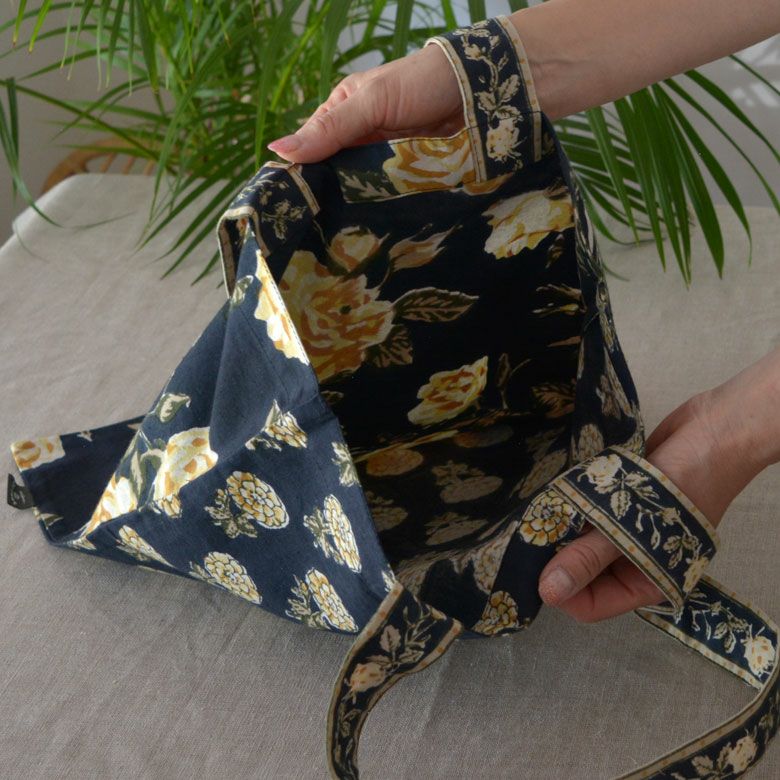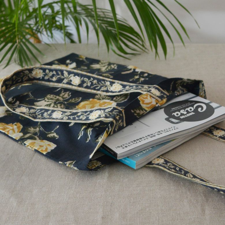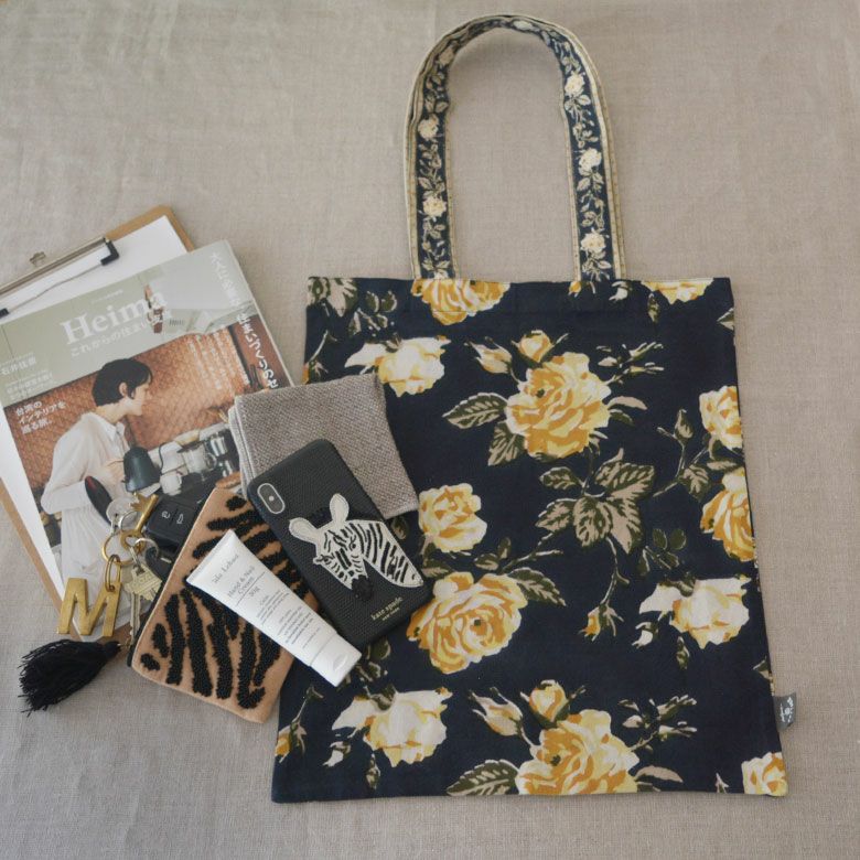 こちらのブラックは炭黒に大きめの黄色いバラがモチーフで大人っぽいイメージ。 少しかすれた風合いの黒×黄色がバックの印象を優しくしてくれています。 表裏の柄の違いはっきりしているので、ひとつのバックで2柄楽しめる欲張りなトートバックです。