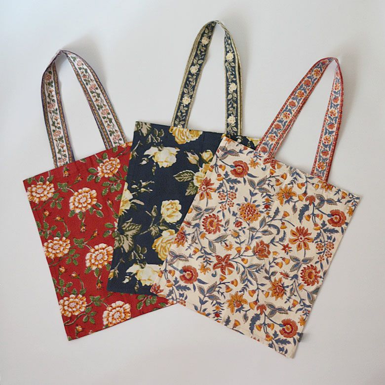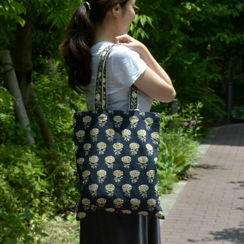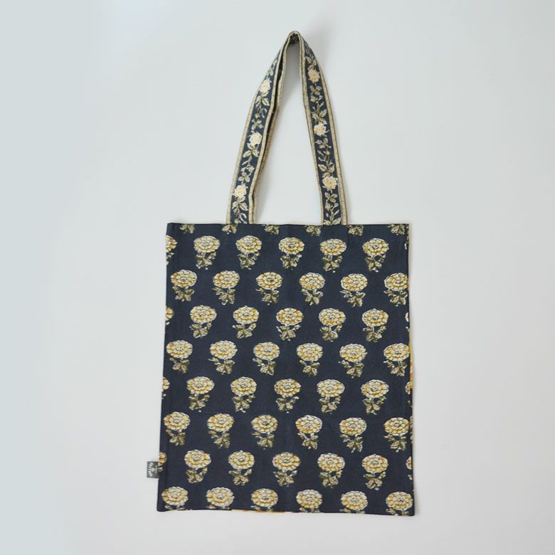 鮮やかでちょっとレトロな模様がキュートな、インドのブロックプリントのトートバック。