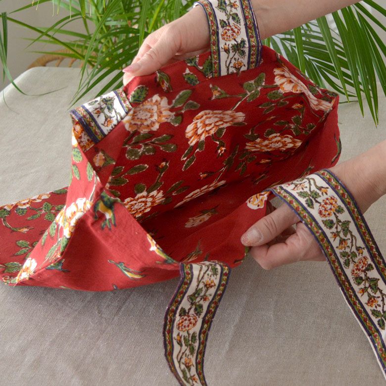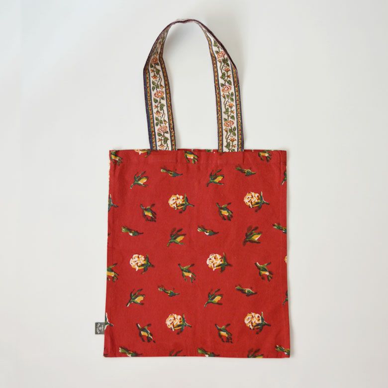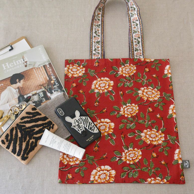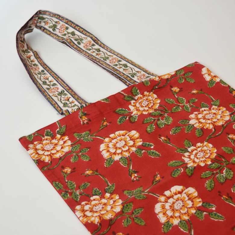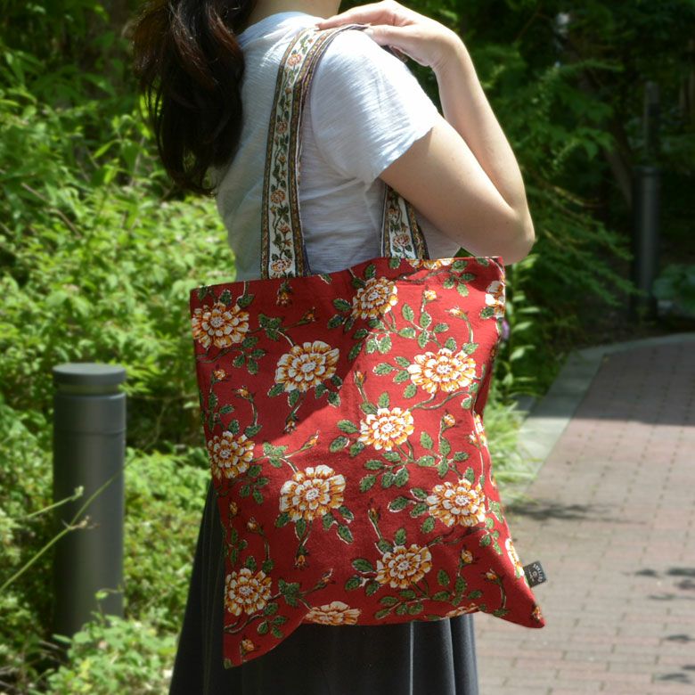 こちらのレッドは、落ちついた赤にに大きめのボタンのような黄色い花がモチーフでとってもキュート。 インドのファブリックらしい鮮やかな色合いで、とても目を引きます。 表裏の柄の違いはっきりしているので、ひとつのバックで2柄楽しめる欲張りなトートバックです。