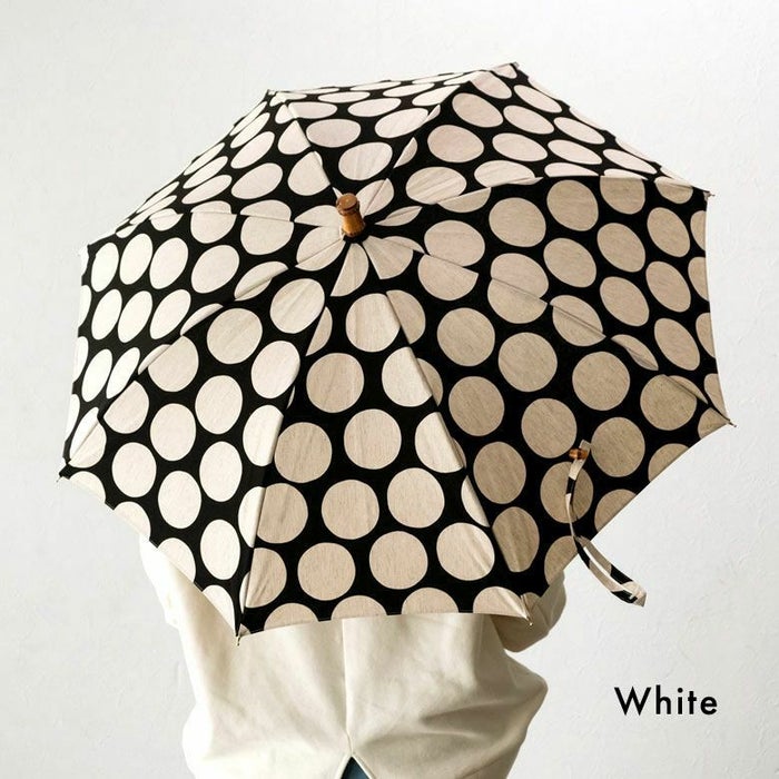 綿麻の混合生地に、大きな水玉が描かれた日傘。上質で飽きのこないシンプルなデザインは、どんなファッションにもよく合います。