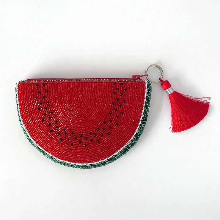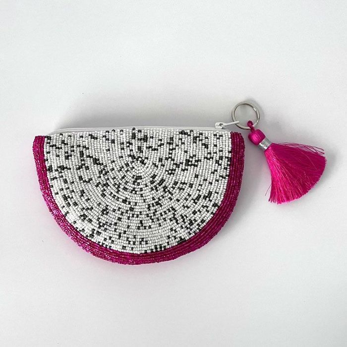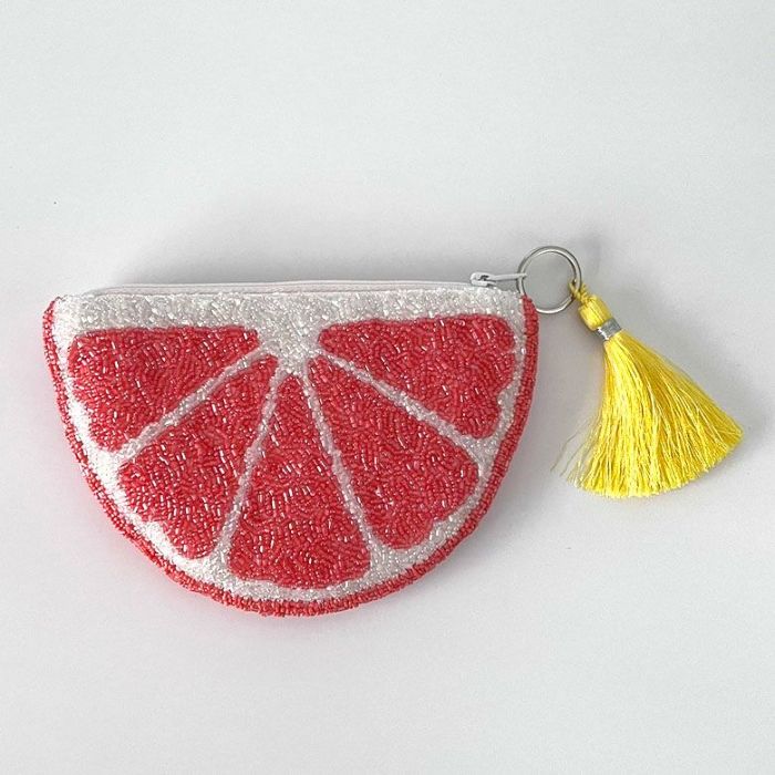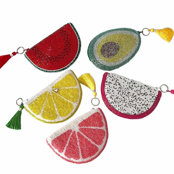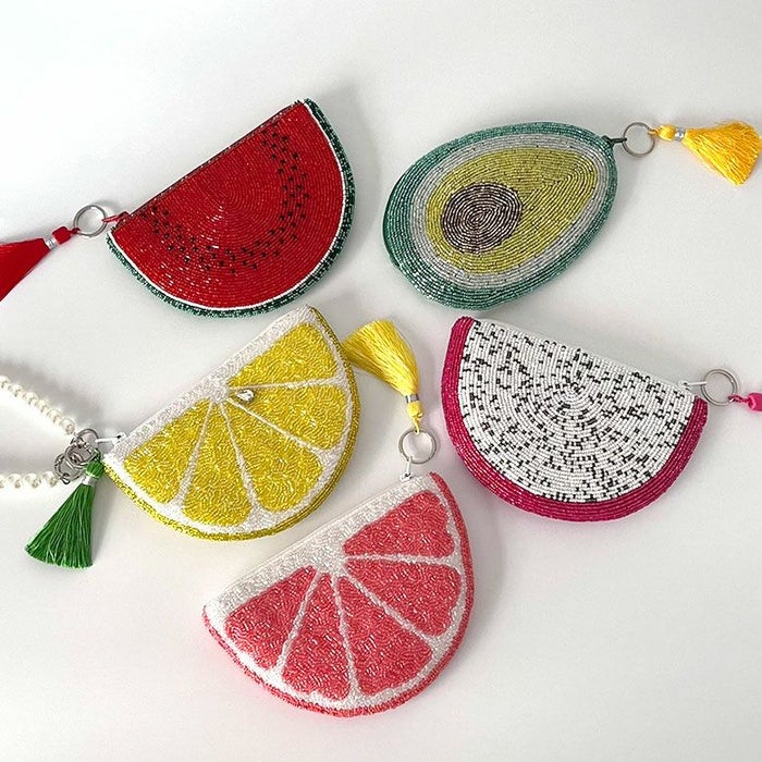 グレープフルーツ・レモン・ドラゴンフルーツ・アボカド・スイカ、どれをとってもとびっきりの色合いのビーズで仕上げられたポーチは宝石のように美しいビーズ選び。カラフルなポーチで気分を上げてHappyに。