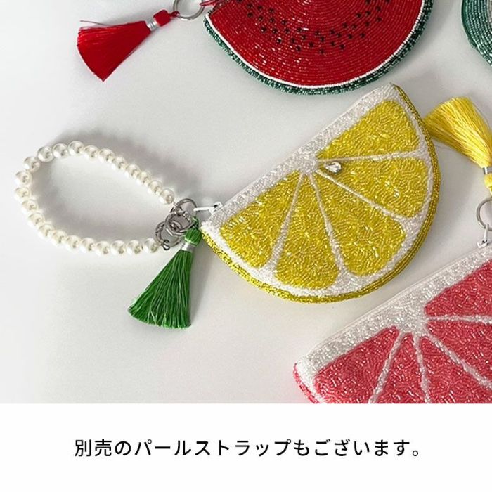 鞄の中に入れてしまうのがもったいないという方にはフルーツポーチとセットになるパールのストラップもご用意しております。セットでお使い頂けると、ミニクラッチのようにもなりますよ。