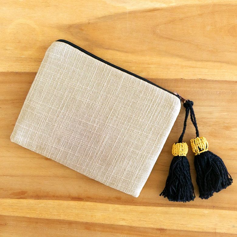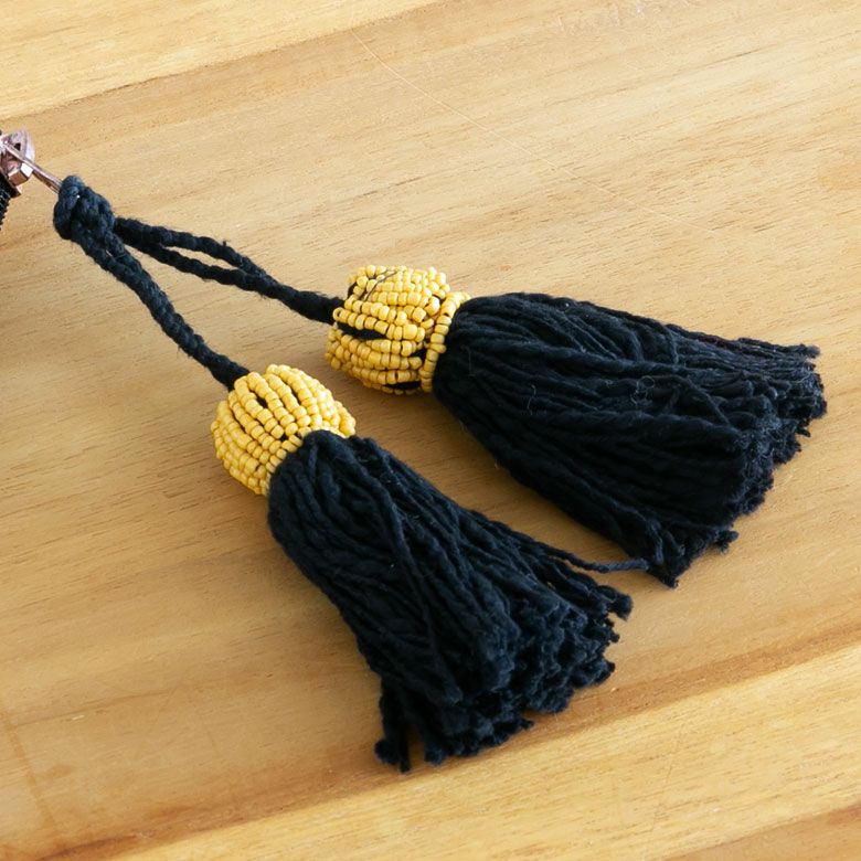 持ち手の大ぶりのタッセルにはビーズも施され2つも付いて可愛さUP☆