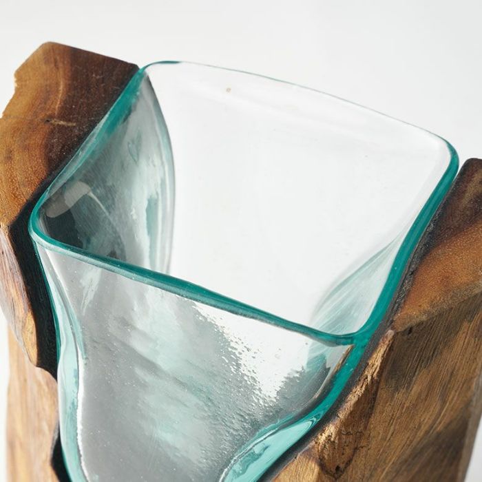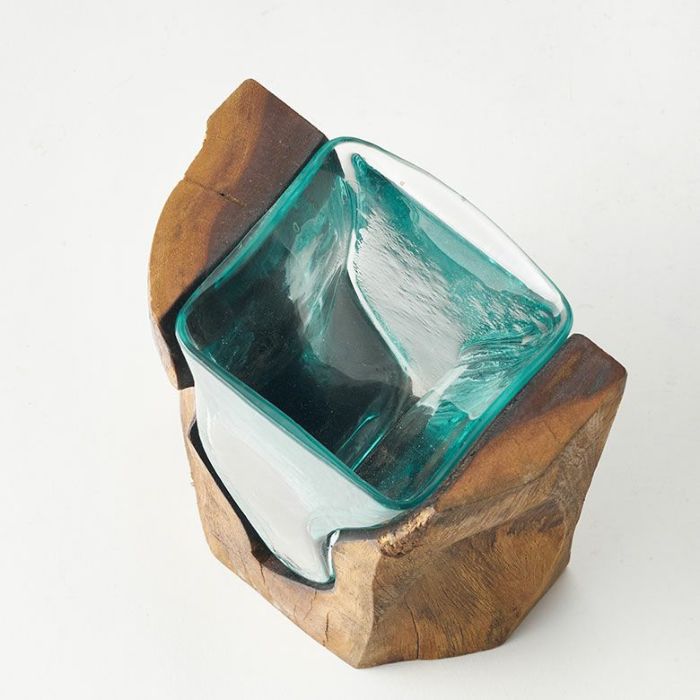 スワールウッドと呼ばれる木の流木とリサイクルガラスを合わせた、世界に二つとないフラワーベースです。新しい木ではなく流木を使用することで、味わい深い個性が生まれ、花やグリーンをより自然な形で引き立ててくれます。