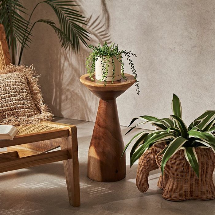 東南アジアのリゾートホテルのようなシックで品のいいインテリアにピッタリなサイドテーブルです。お手持ちのファブリックやレザーのソファとの合わせ、アタやラフィアの天然素材との合わせは、インテリアに奥深さを与え、お部屋に落ち着いた雰囲気を与えてくれます。