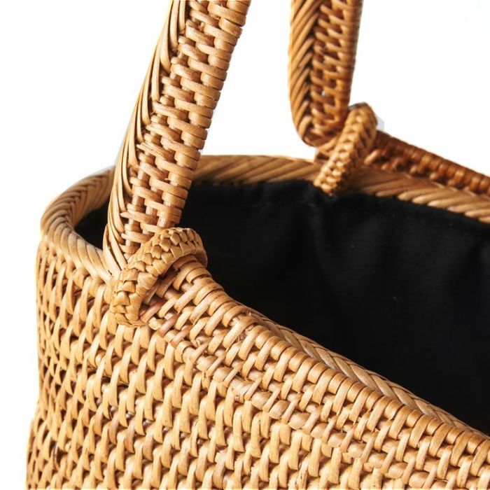 中にはブラック、もしくはアイボリーの巾着が付いており、中が丸見えにならず、中に入れるものも傷つけずに収納することができます。内布は紐でしっかりと絞れるため、混雑した場所でも安心です。巾着の内側には鍵などを収納できる小さなポケットも付いていて、カゴバッグでありながら機能性も充実しています。