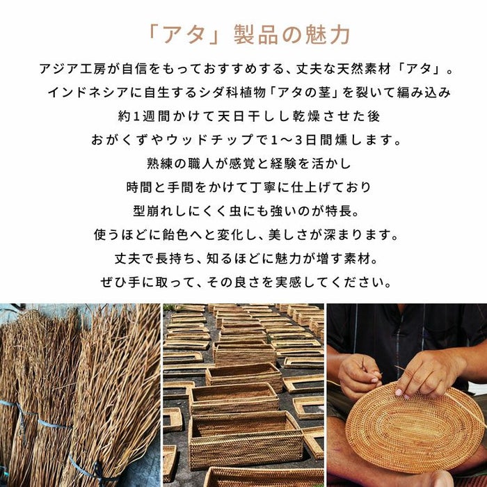 幅広いテイストに馴染み、飽きのこない品格を持つ人気素材「アタ」。 アタ雑貨は制作に多くの時間を要し、編み手も年々少なくなってきていると言われています。当店で取り扱っている製品は、インドネシアの熟練職人が、ひと編みひと編み丁寧に手作業で仕上げたもの。非常に丈夫で、大切に使えば10年、20年と長くご愛用いただけます。ライフスタイルに合わせて中に入れるものを変え、長く大切にお使い頂ける当店自慢のアタ雑貨です。